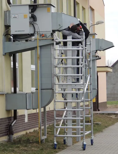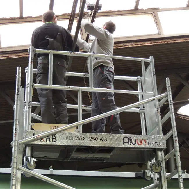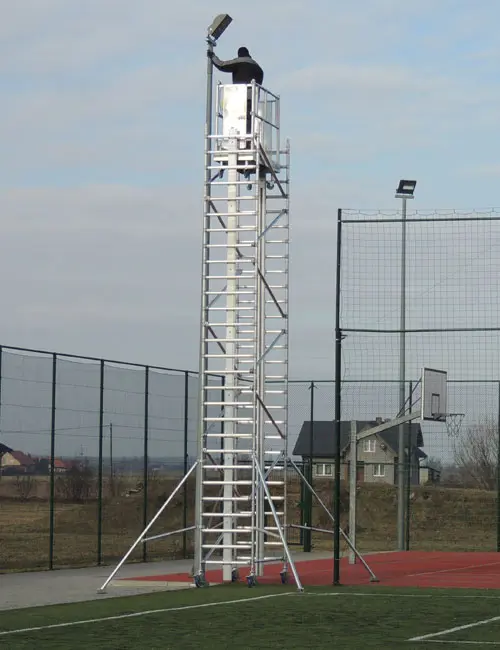 Está construído en aluminio tubular de Ø50 mm resistente al óxido con plataforma antideslizante de aluminio grecado.