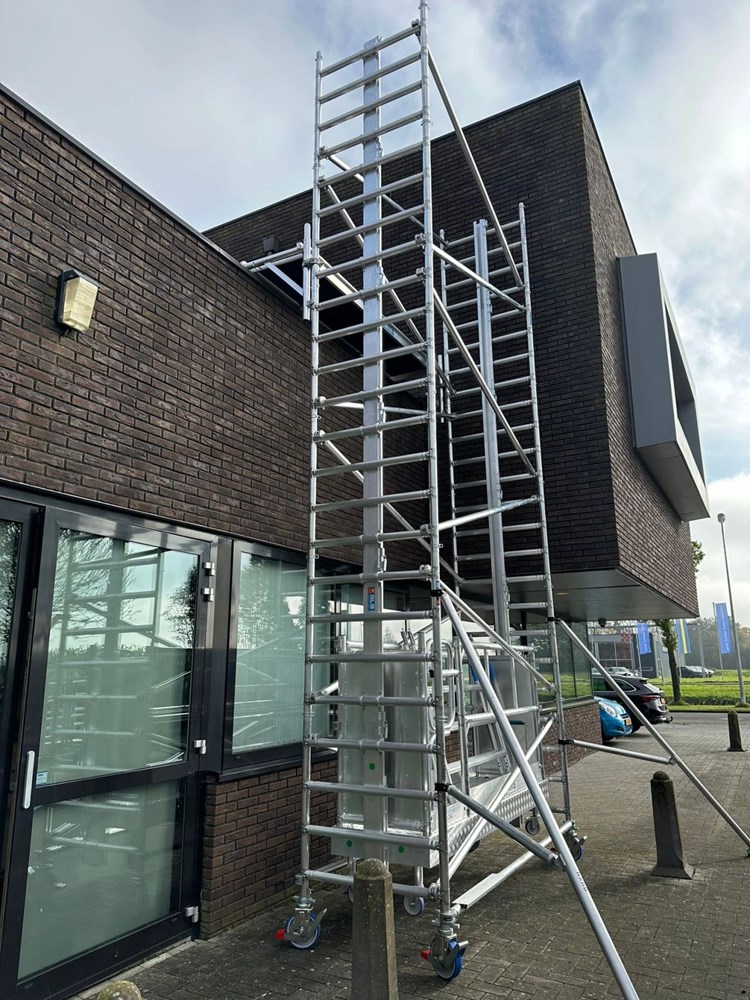 Andamio de aluminio con plataforma elevadora eléctrica, que alcanza hasta 12 metros de altura. Muy ligero y fácil de transportar. Se monta en pocos minutos sin necesidad de herramientas.