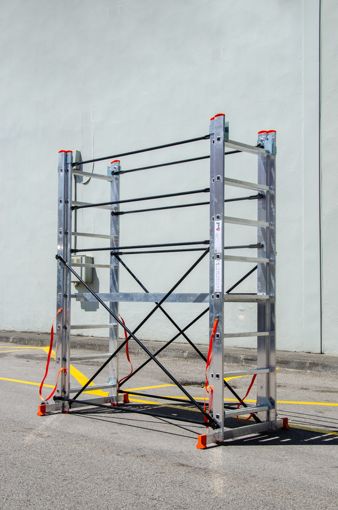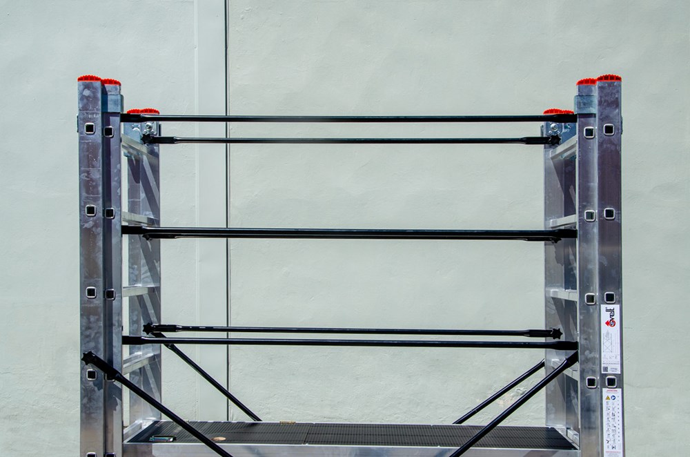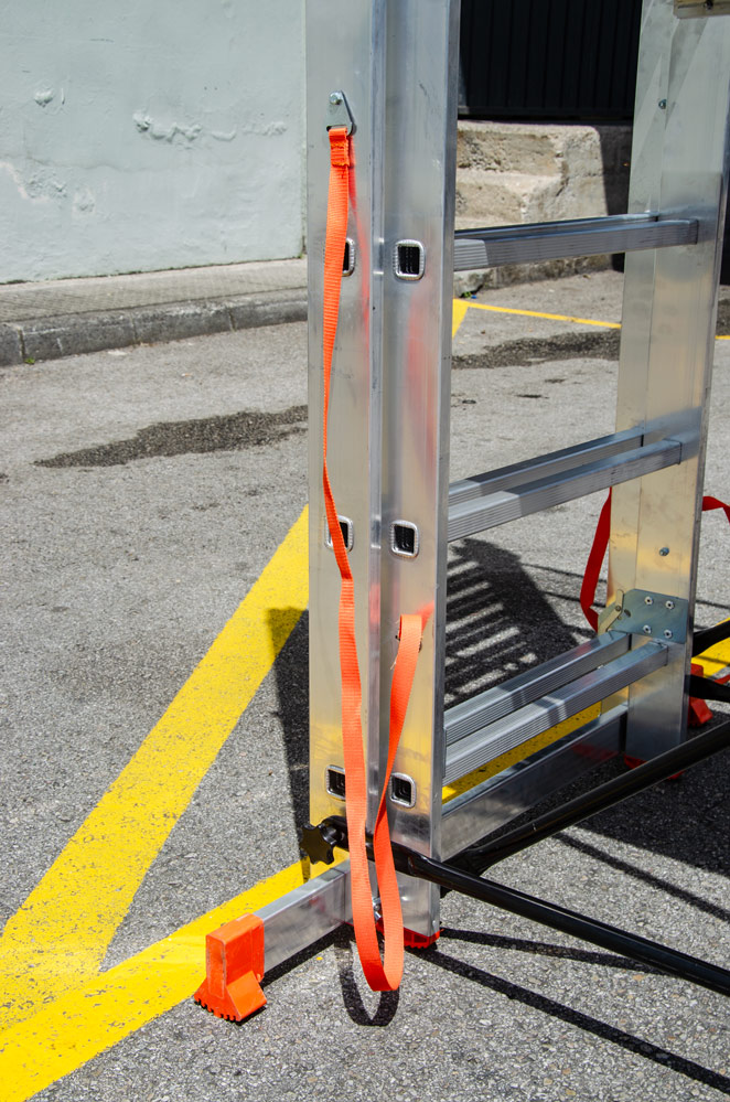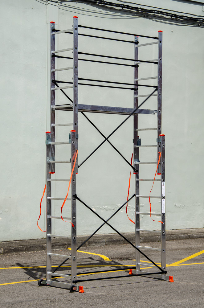Equipo de trabajo en altura compuesto por 2 escaleras de aluminio transformables, por barras diagonales y horizontales de enganche rápido de acero pintado con polvo epoxi que conforman una estructura rígida y estable.