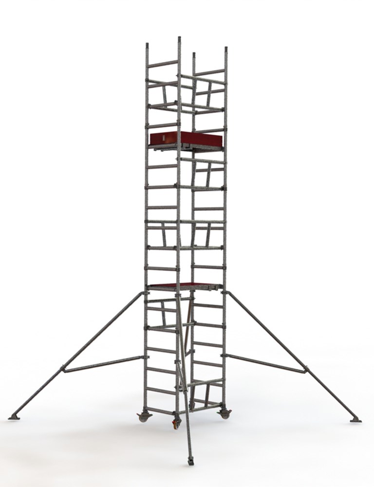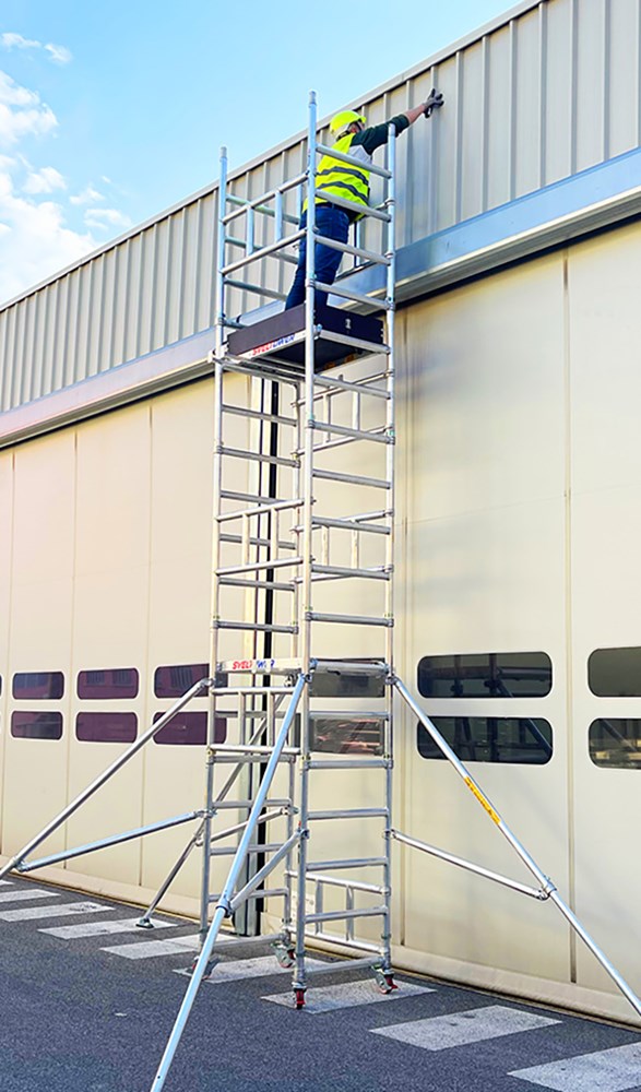 Andamio profesional de aluminio ultracompacto, diseñado para un montaje seguro y rápido por una sola persona, sin necesidad de bajar al suelo durante el montaje.