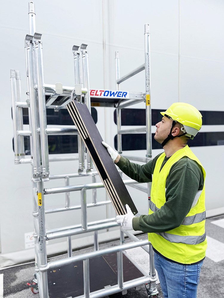 Andamio profesional de aluminio ultracompacto, diseñado para un montaje seguro y rápido por una sola persona, sin necesidad de bajar al suelo durante el montaje.