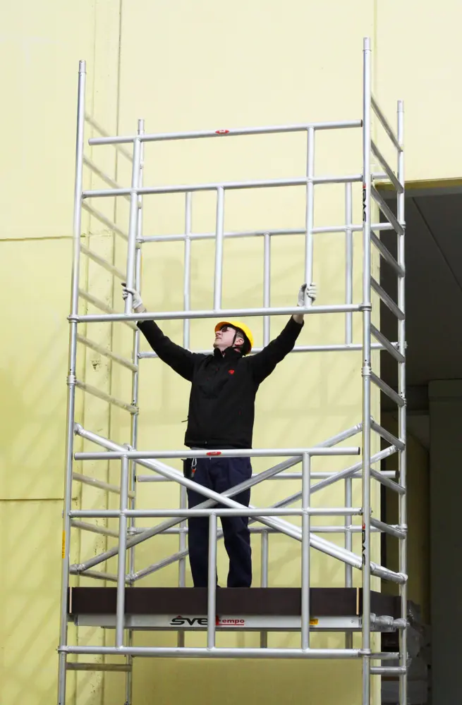 Andamio profesional de aluminio de montaje rápido con protección constante del operador. Esta es una variante del andamio Tempo Tech que permite al operador montar y desmontar el andamio sin utilizar EPI (Equipo de protección personal). El operador puede montar las barandillas de protección directamente desde el suelo.
