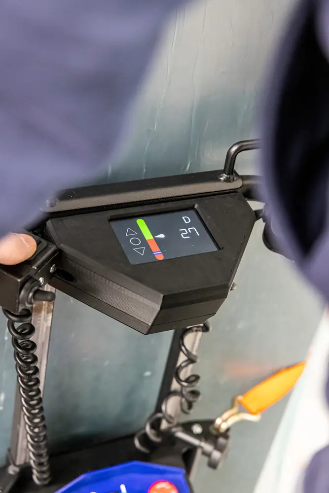 Incluye un acelerador para el ajuste gradual de las cadenas y un indicador en el brazo del timón que ayuda al usuario a ajustar manualmente la inclinación, garantizando la máxima seguridad en todo momento.