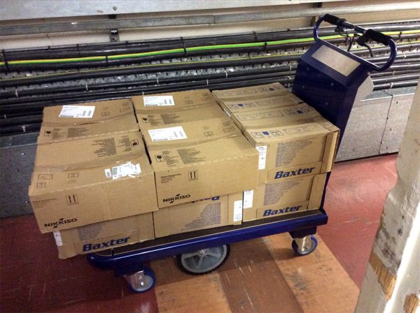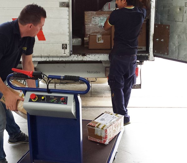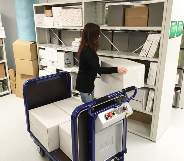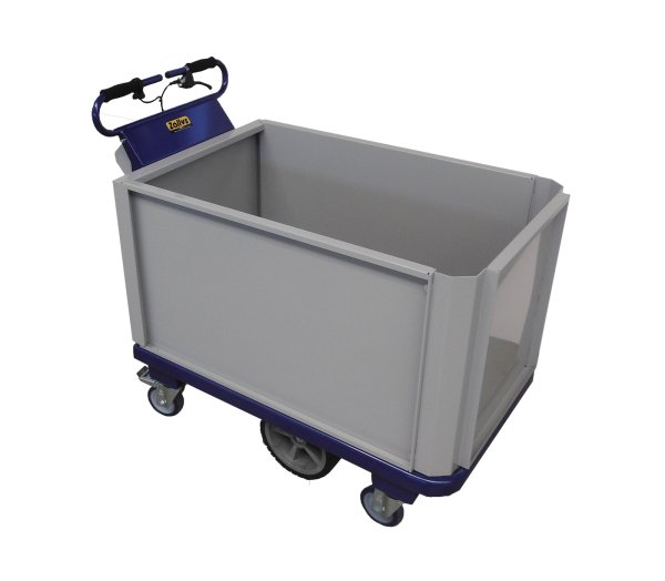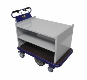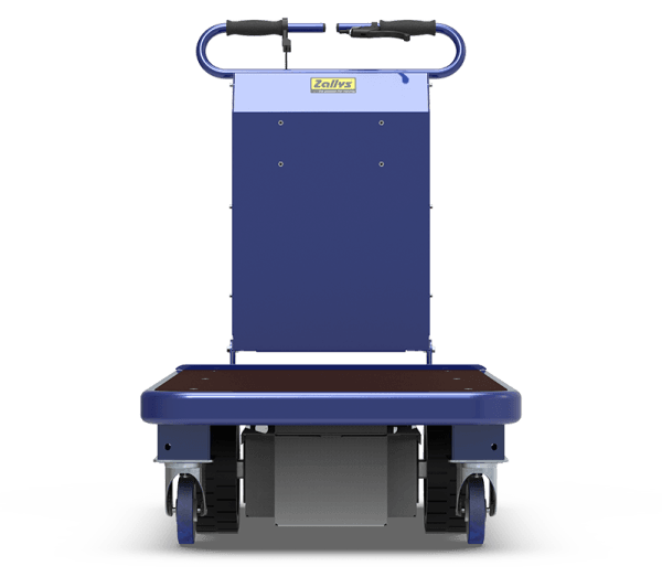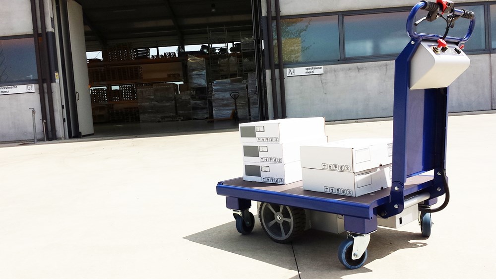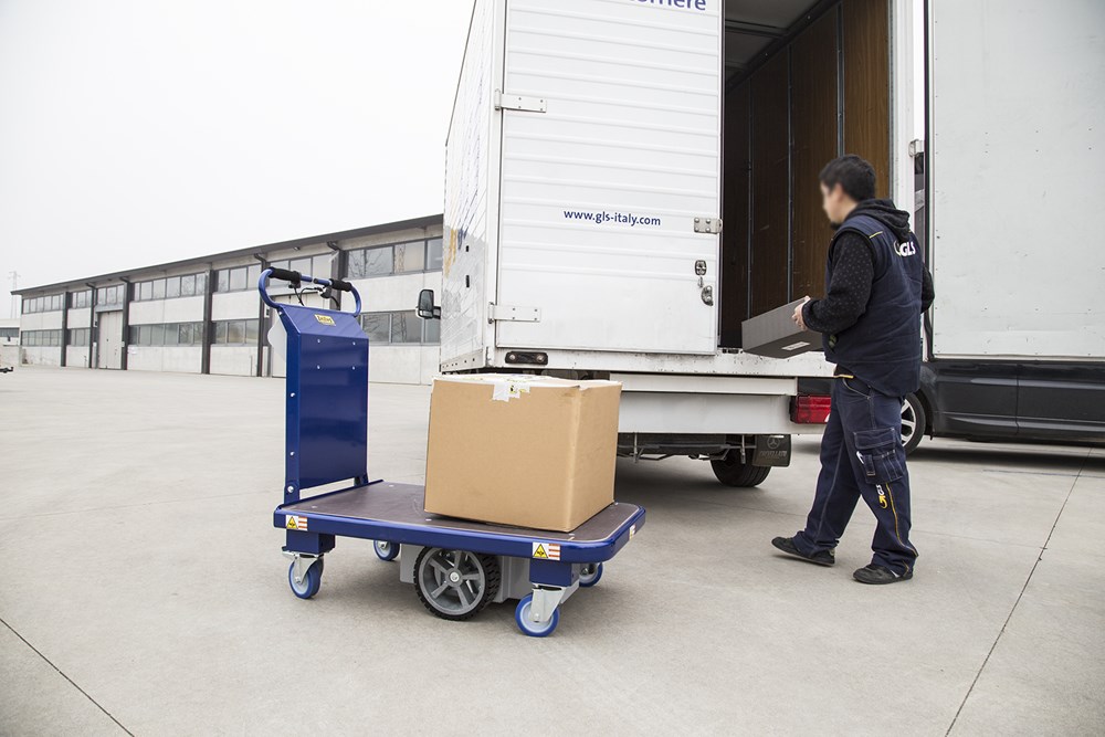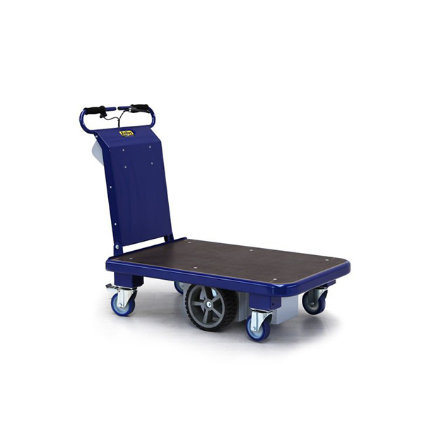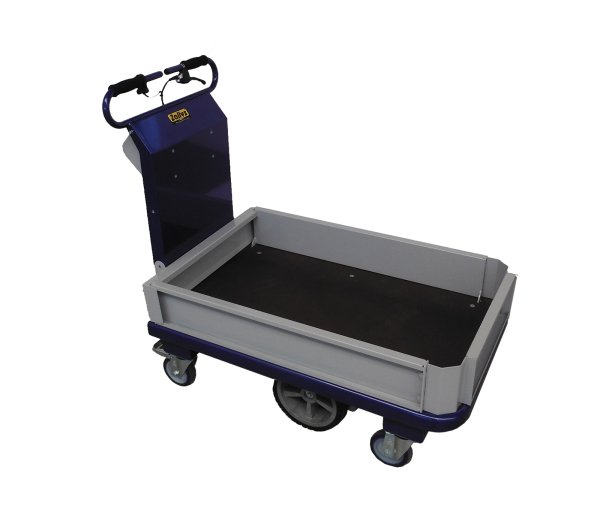 Carro eléctrico con plataforma, equipado con un freno electromagnético de bloqueo. Cabe en ascensores y pasa a través de puertas y espacios reducidos, incluye baterías y cargador.