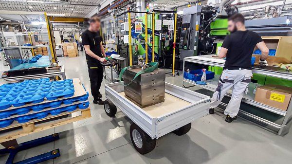 El transportador eléctrico de carga con 4 ruedas y plataforma Zallys Jespi L facilita el manejo de cargas y puede usarse como un chasis eléctrico para transportar otros equipos.