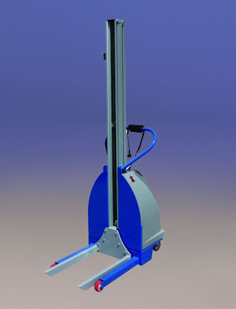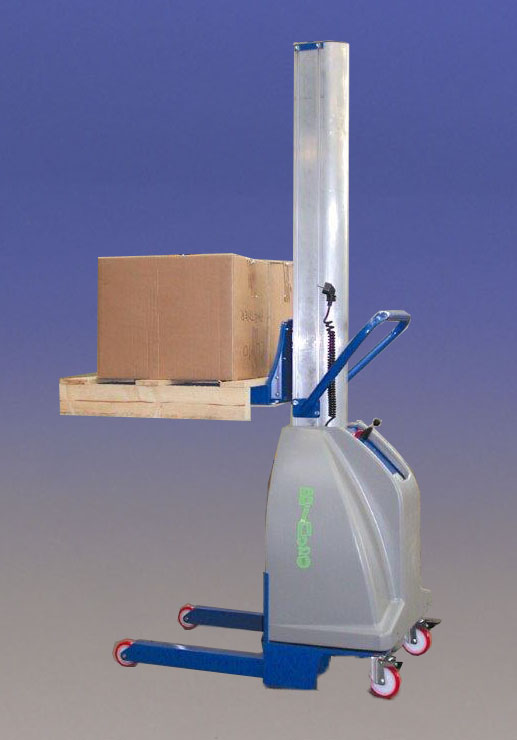 Elevador multifuncional con tracción manual y elevación eléctrica, con mástil de aluminio para asegurar ligereza y gran capacidad de maniobra. Con una capacidad de 100 kg y una elevación de 1500 mm.