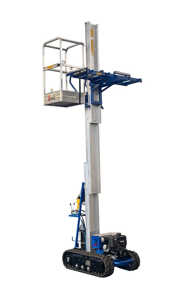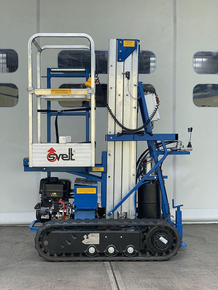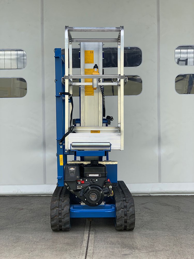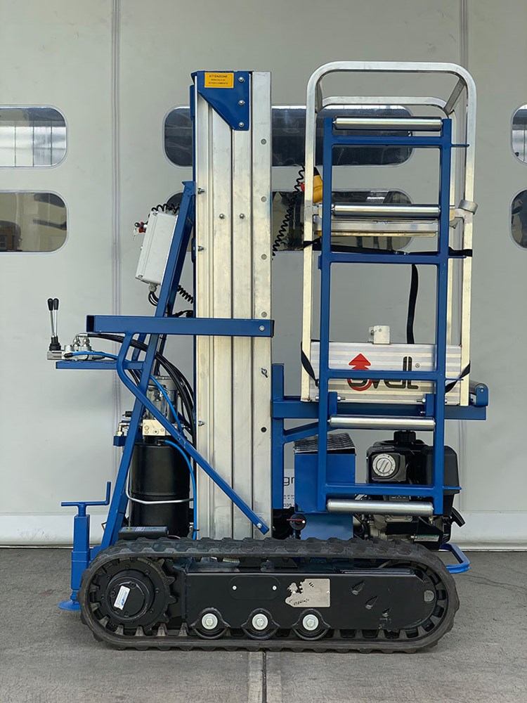 Plataforma elevadora portaféretros compacto y manejable con columna elevadora de aluminio, base de acero y ruedas de oruga para el transporte.