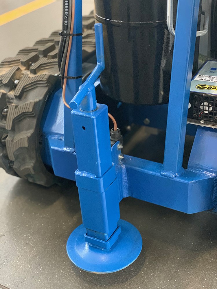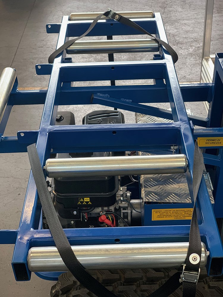 Sus ruedas de oruga permiten su circulación por cualquier superficie (grava, barro, tierra) y la superación de peldaños y pequeños obstáculos (mediante el uso de rampas especiales que protegen los escalones).