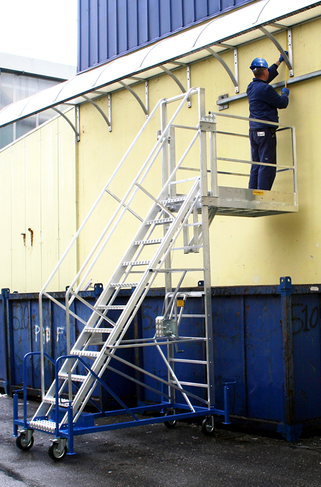 Escalera móvil de castillo con plataforma regulable en altura y protección colectiva