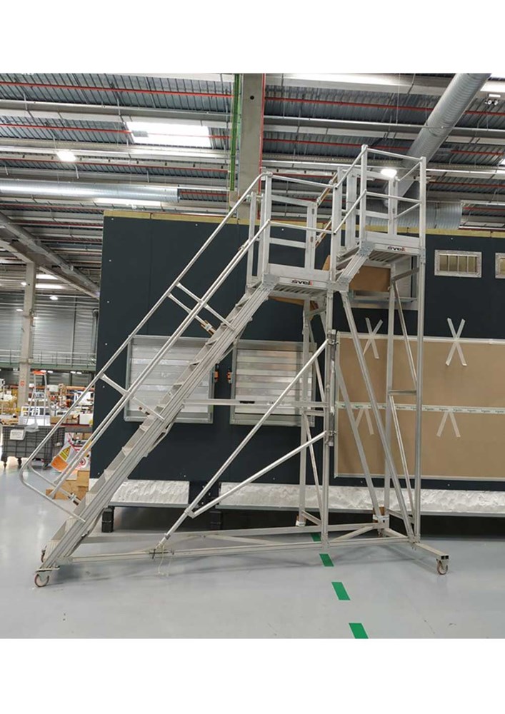 El estabilizador esta desplazado para poder pegar completamente la escalera al lugar de acceso, tiene 4 ruedas de 125 mm con freno asi como barandillaen ambos lados de la subida.