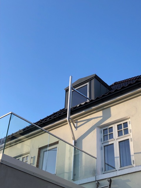 Escalera de inspección, cuenta con un sistema de acceso único e innovador. Está constituido por escaleras en aluminio anodizado que, cuando no son utilizadas se pliegan y parecen un canalón. Se mimetizan y no ensucian la estética de la fachada del edificio.