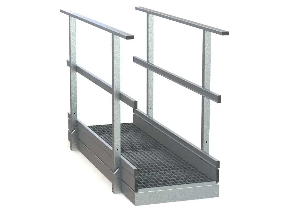 Las pasarelas modulares se instalan sobre la superficie de la cubierta o revestimiento para crear un camino continuo y seguro con barandillas a ambos lados. Su diseño modular permite ensamblar tramos según la longitud y la forma necesarias, proporcionando una solución personalizada que se adapta a cada contexto de instalación. La superficie antideslizante y la estructura estable permiten el tránsito de personas con seguridad incluso sobre superficies inclinadas o con humedad.