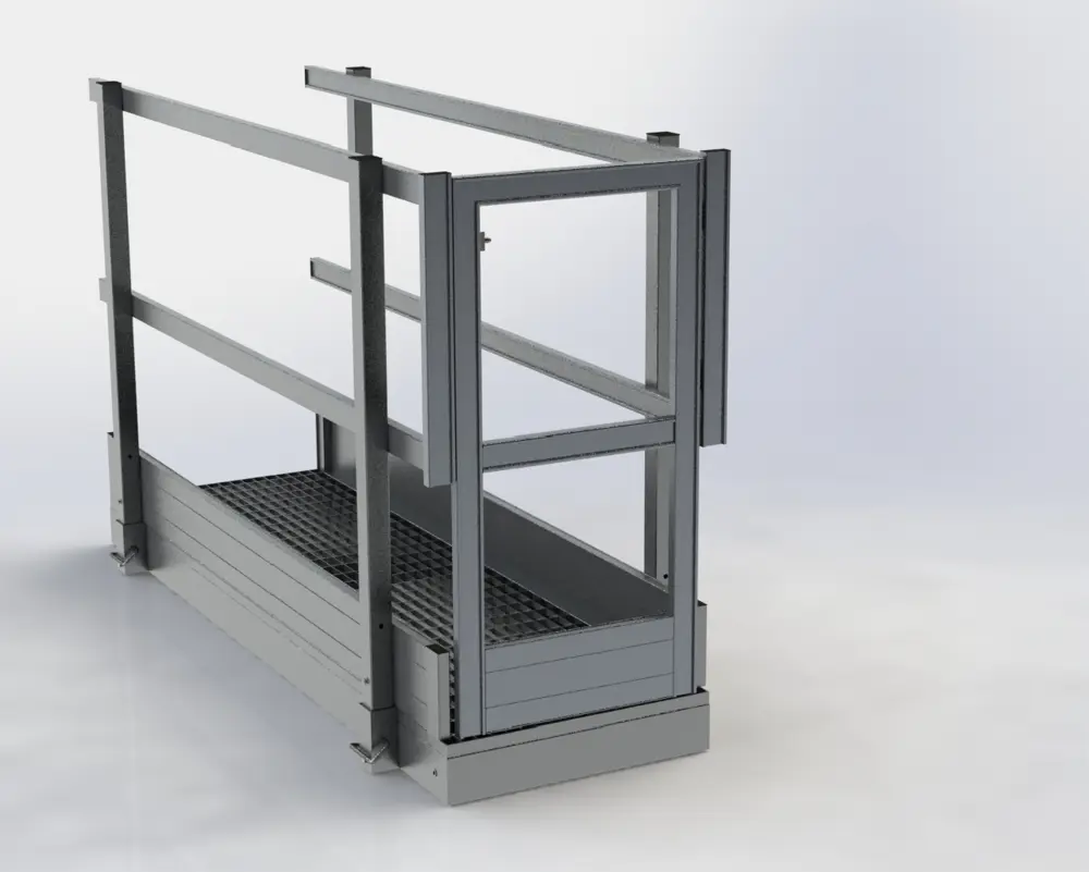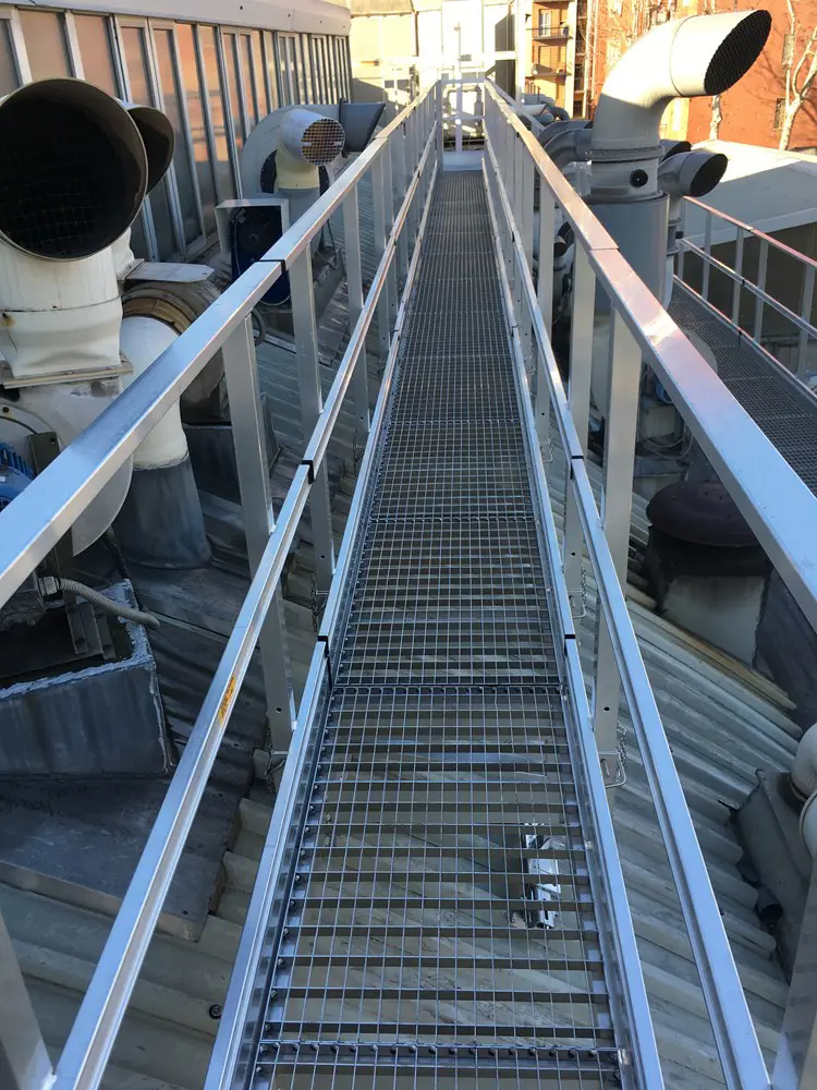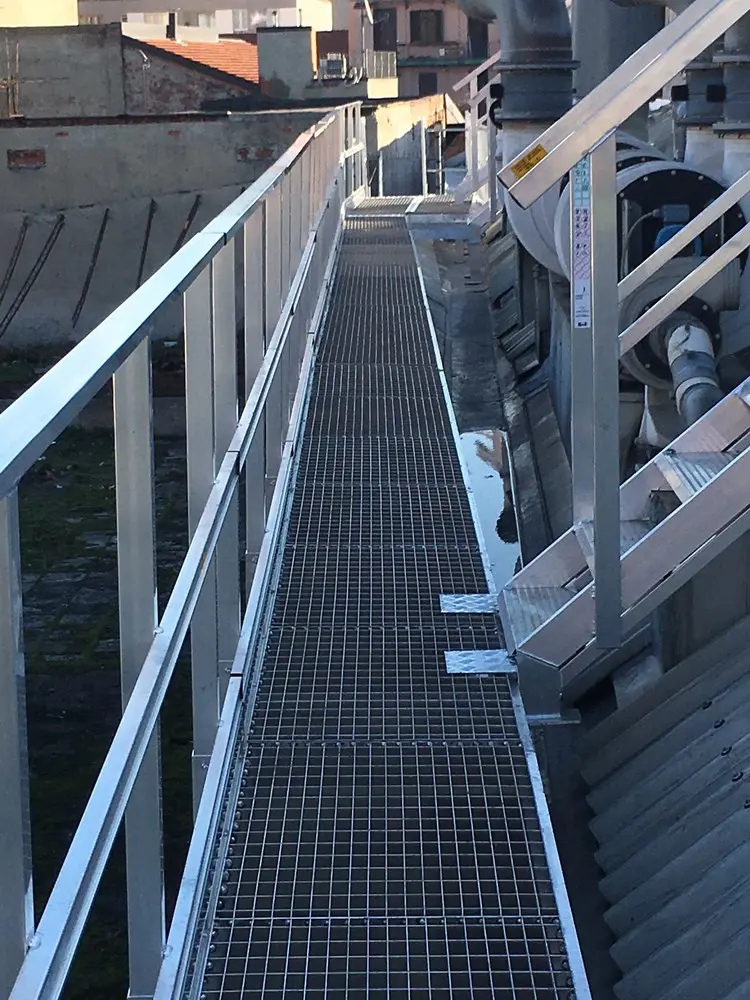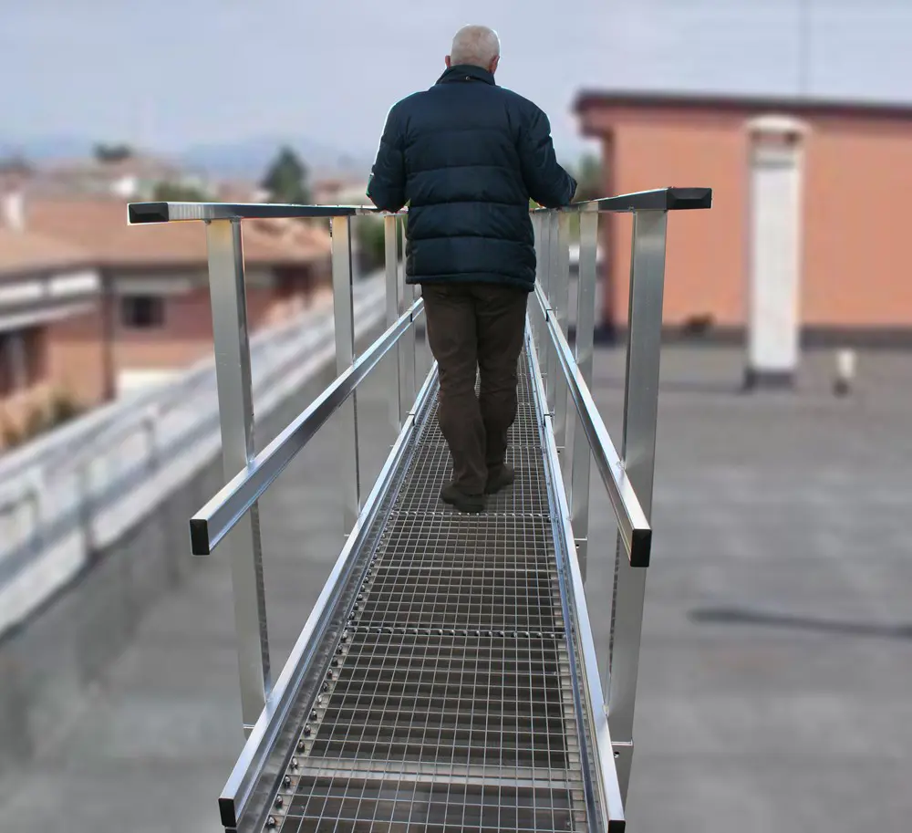 - Pasarelas peatonales modulares en aluminio para tránsito seguro sobre cubiertas y revestimientos.