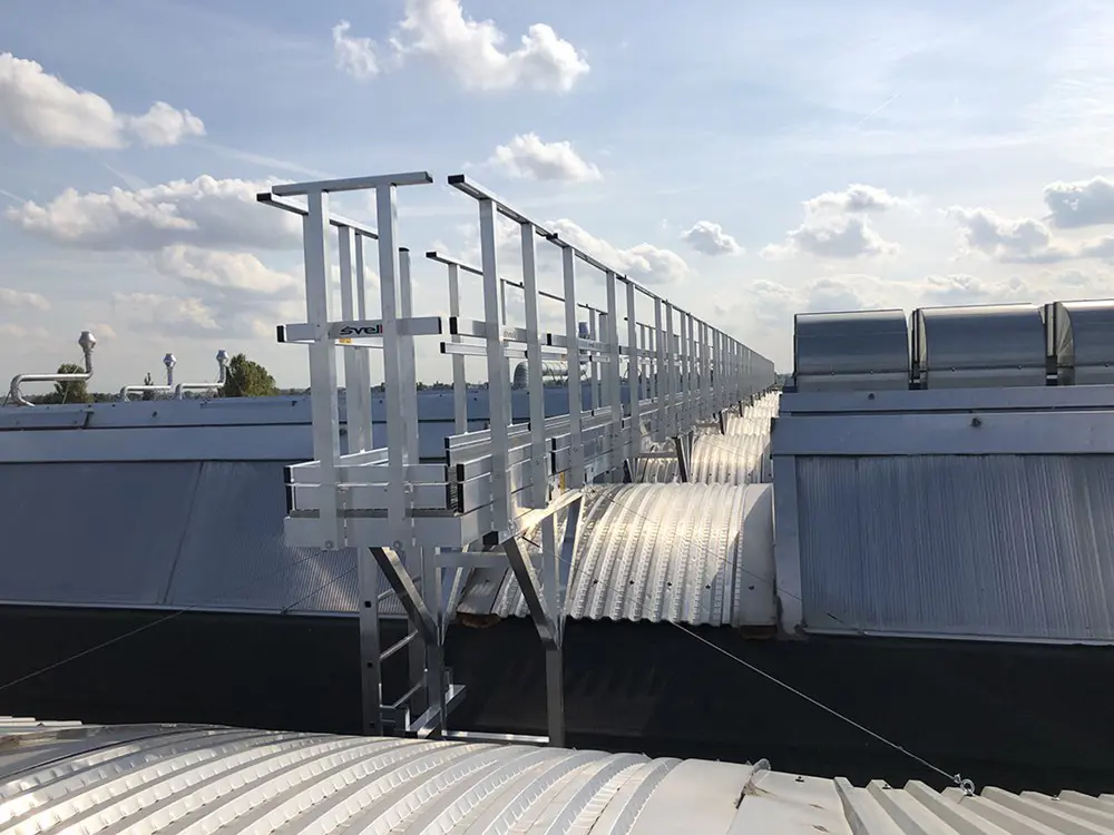 Fabricadas en aluminio resistente y ligero, las pasarelas modulares combinan durabilidad con facilidad de instalación y pueden ajustarse a diferentes longitudes y formas de cubierta sin interferir con los elementos estructurales o de drenaje existentes.