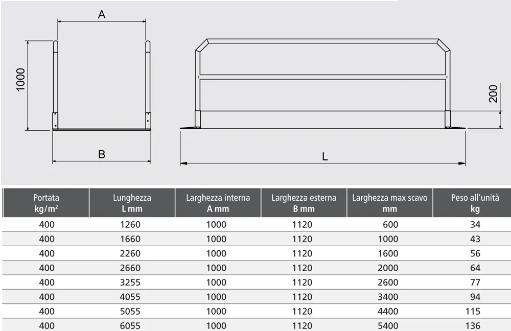 | REF. | Largo L (cm) | Ancho interior A (cm) | Ancho exterior B (cm) | Peso (kg) |