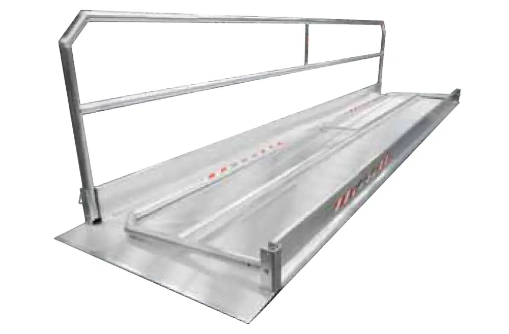 Las pasarelas peatonales con pasamanos de esta gama, realizadas con perfiles especiales de aluminio extruido, permiten a cualquiera superar barreras arquitectónicas. Equipada con una superficie de tránsito antideslizante, pasamanos abatibles y rodapiés de seguridad, son especialmente adecuados para utilizarse en posición horizontal.