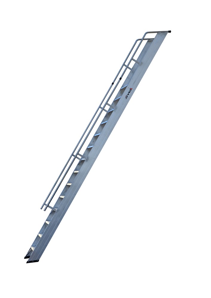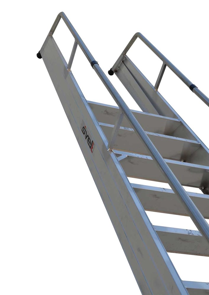 La escalera de acceso con desembarco DIA MAXI está diseñada para proporcionar seguridad, confort y robustez en la subida, tránsito intermedio y bajada entre niveles.