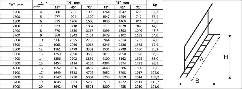 | REF | Altura inclinación mín 19º (cm) | Altura inclinación media 45º(cm) | Altura inclinación máx 71º (cm) | Peso kg |