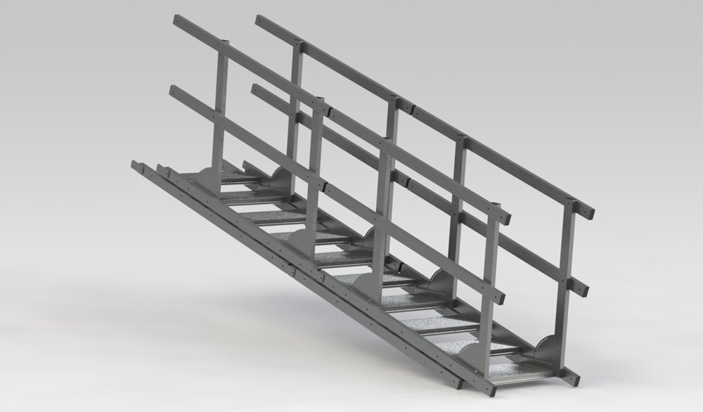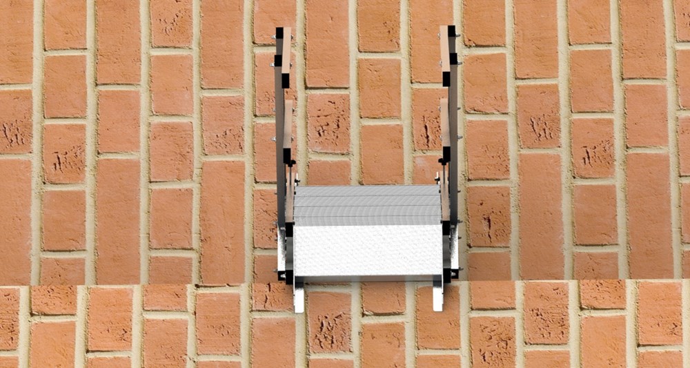 Las amplias zapatas basculantes de apoyo, fabricadas en PVC, permiten cambiar la inclinación de la escalera adaptándose al terreno y manteniendo su estabilidad. Al modificar la altura de desembarco, la inclinación varía manteniendo siempre los peldaños en posición horizontal para una cómoda subida.