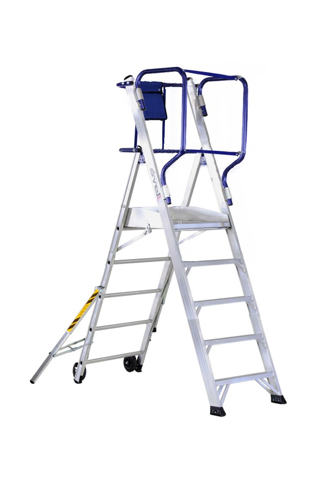 Escalera móvil con plataforma guardacuerpos 360º y barandillas plegables