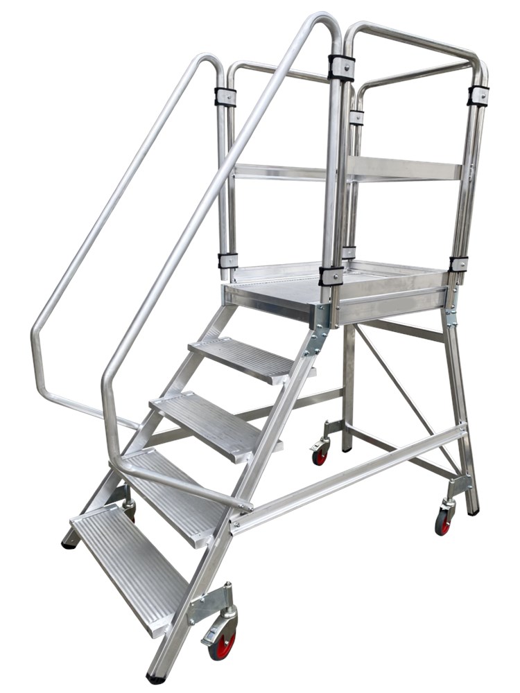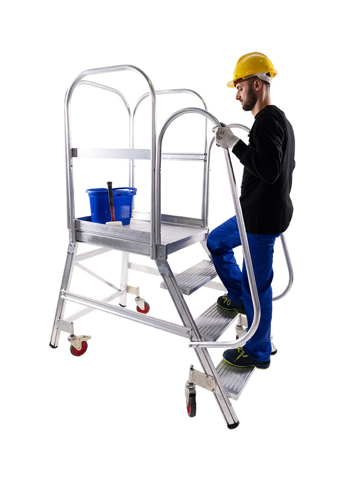 Escalera fabricada en aluminio extruido nervado, dispone de una amplia plataforma de trabajo de 60 x 80 cm, rodapié y guardacuerpo de 1 m de altura que protege al trabajador.