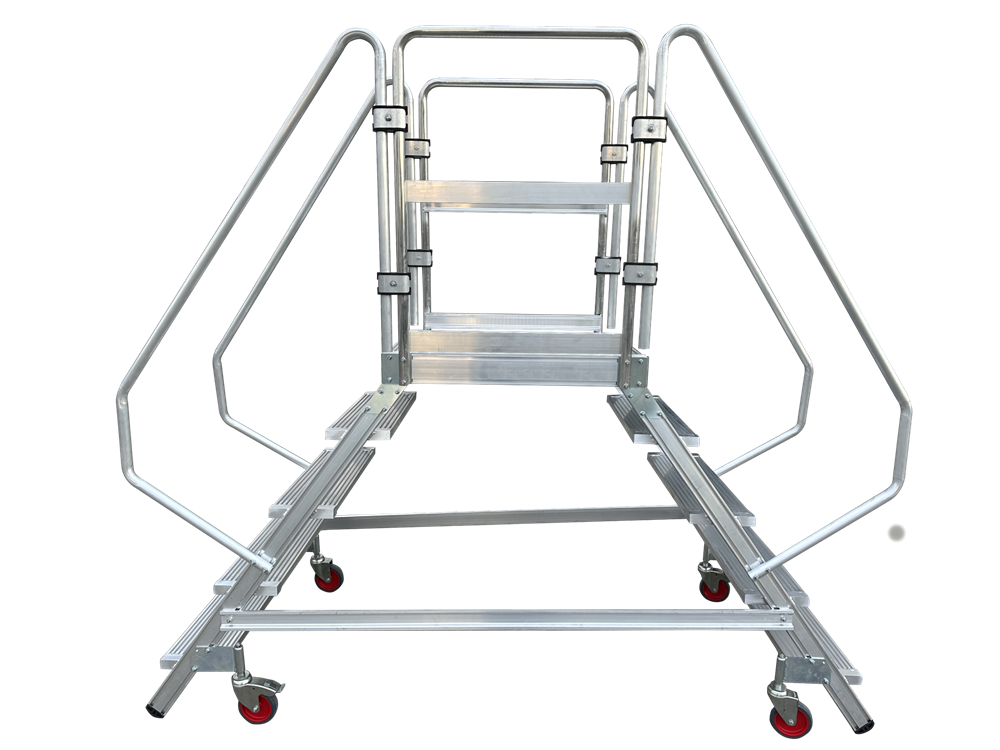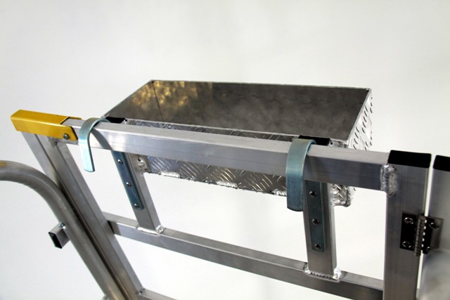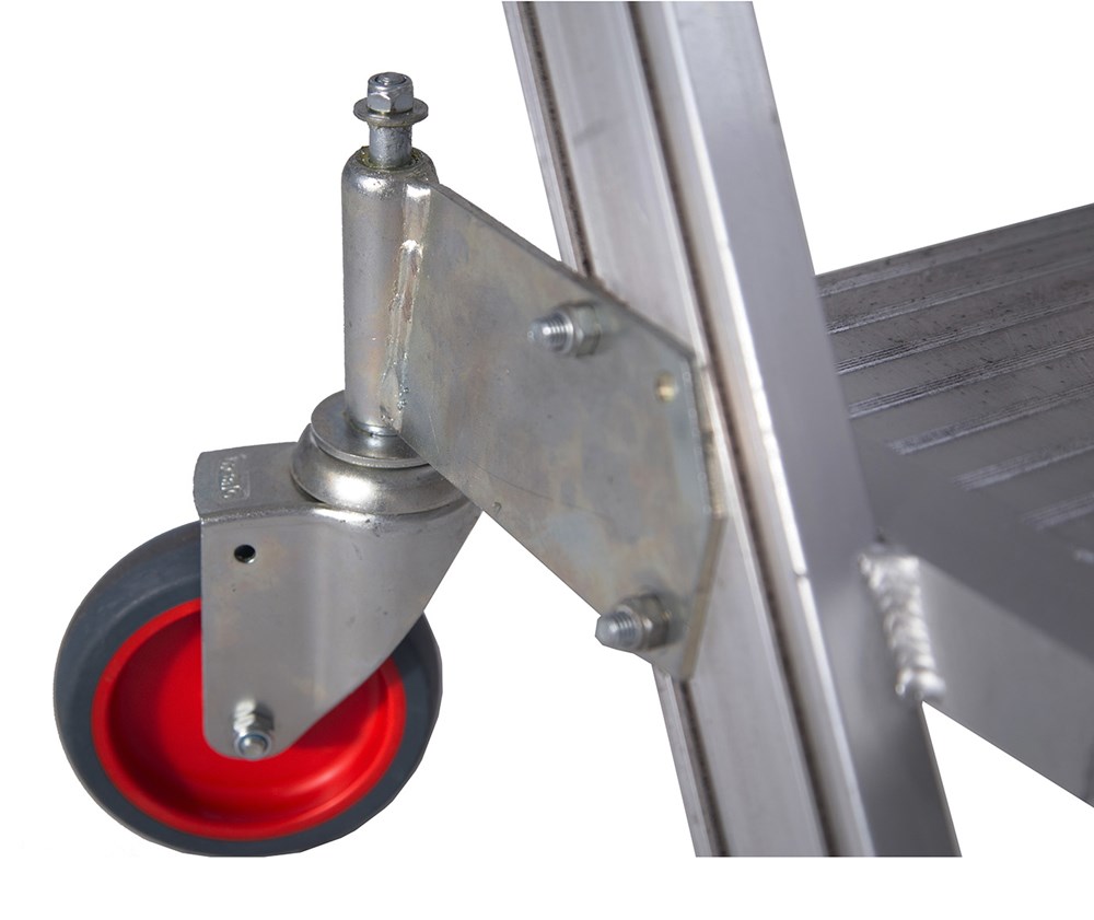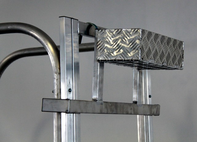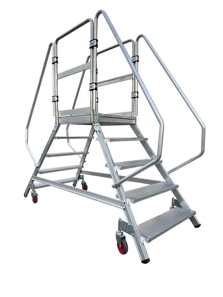 Escalera de almacen móvil de doble subida, fabricada en aluminio extruido nervado. Dispone de una amplia plataforma de trabajo de 60 x80 cm, rodapiés y un guardacuerpo de 1 m de altura que protege al trabajador.