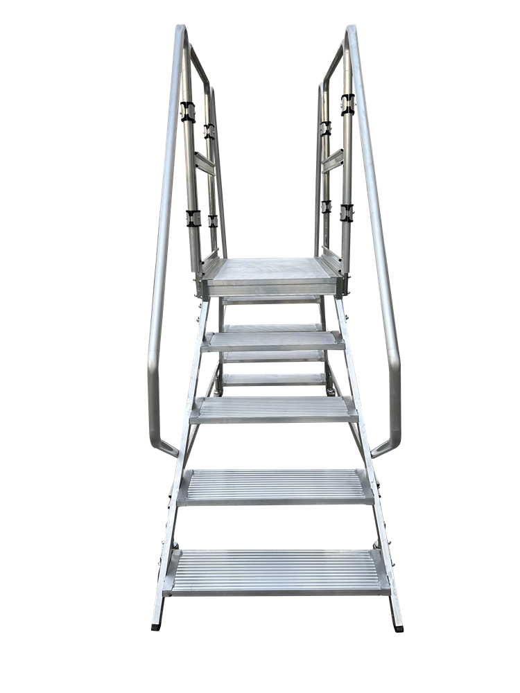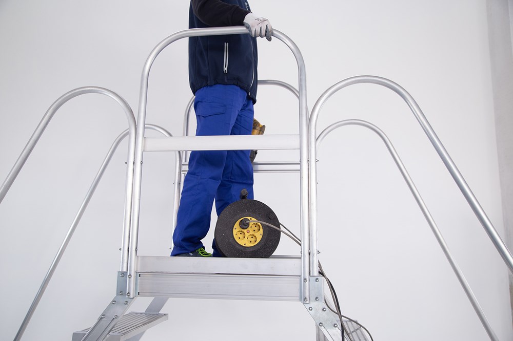 La escalera PUENTE cuenta con una plataforma superior amplia que brinda un punto de apoyo cómodo y seguro para trabajar en altura.