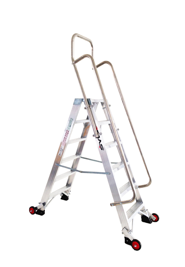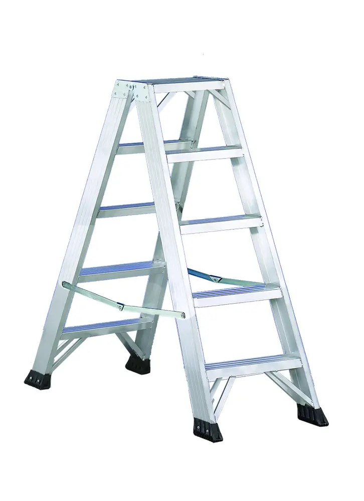 Escalera de tijera de uso profesional, fabricada en aluminio nervado. Los peldaños están soldados a los montantes dando lugar a una estructura sólida y resistente. La plataforma cuenta como peldaño.