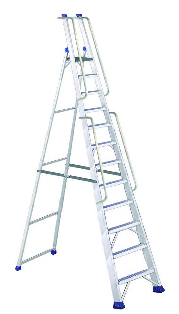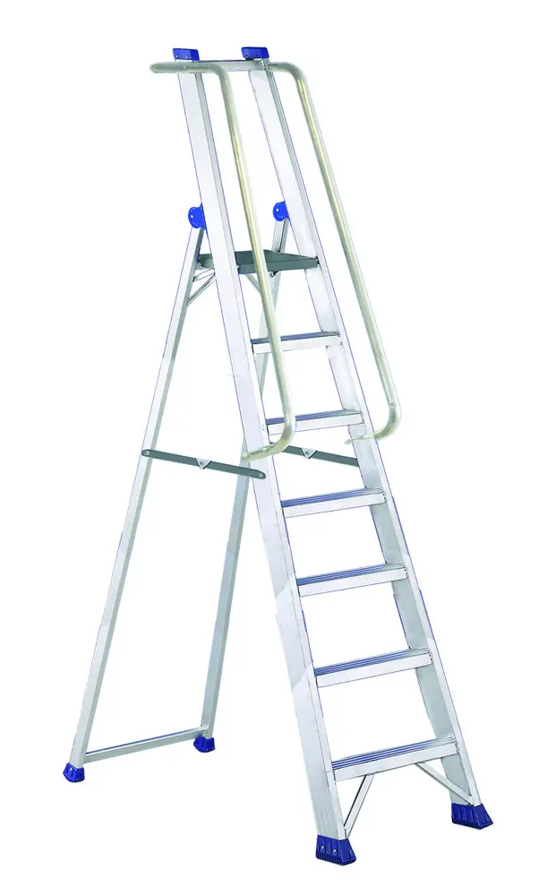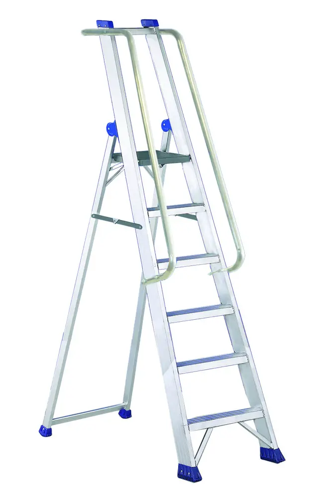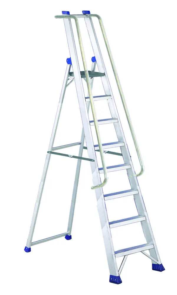 Escalera profesional de tijera con plataforma extragrande y barandillas