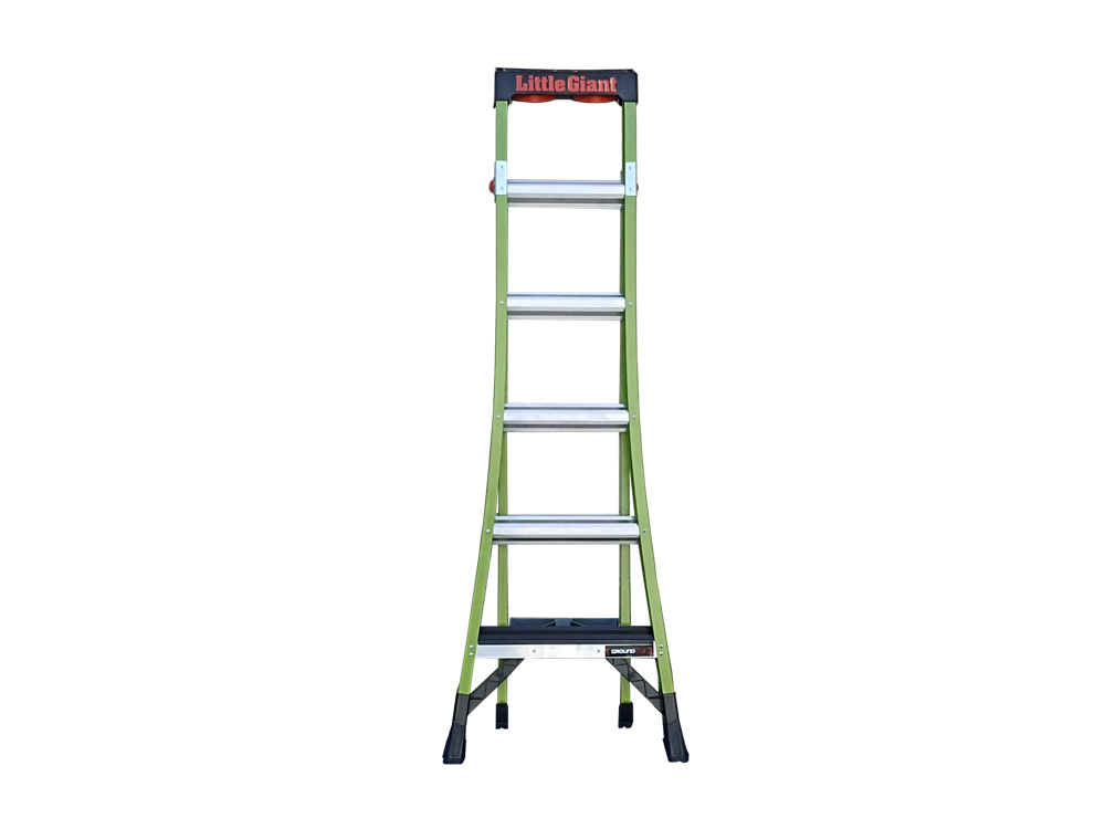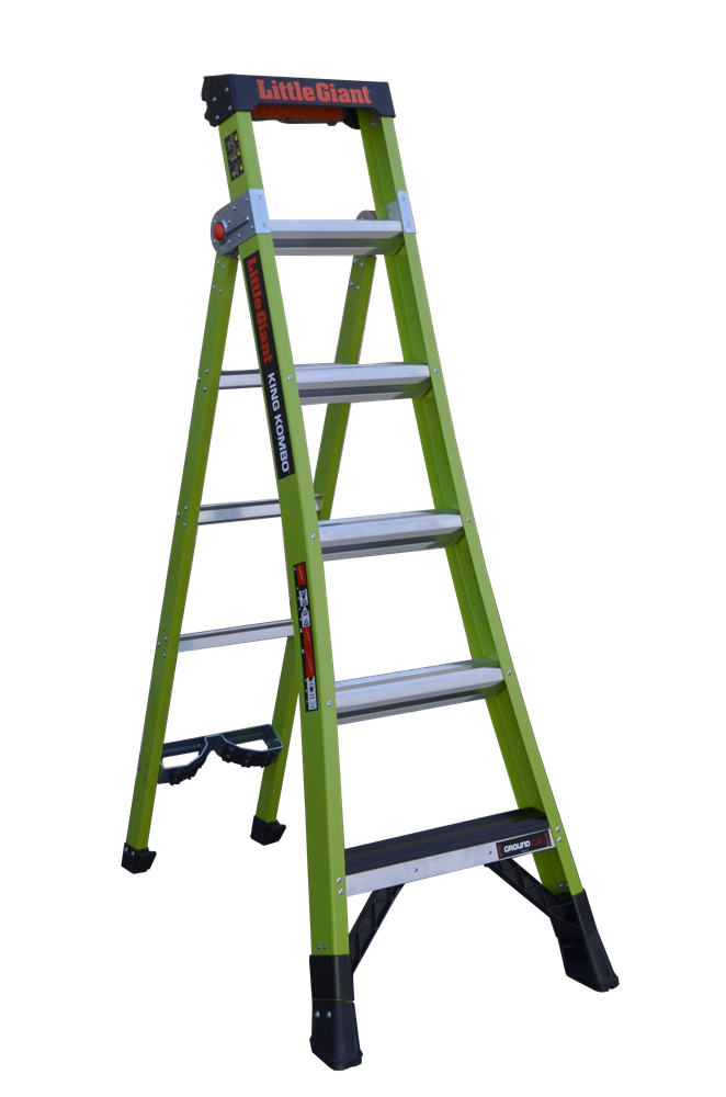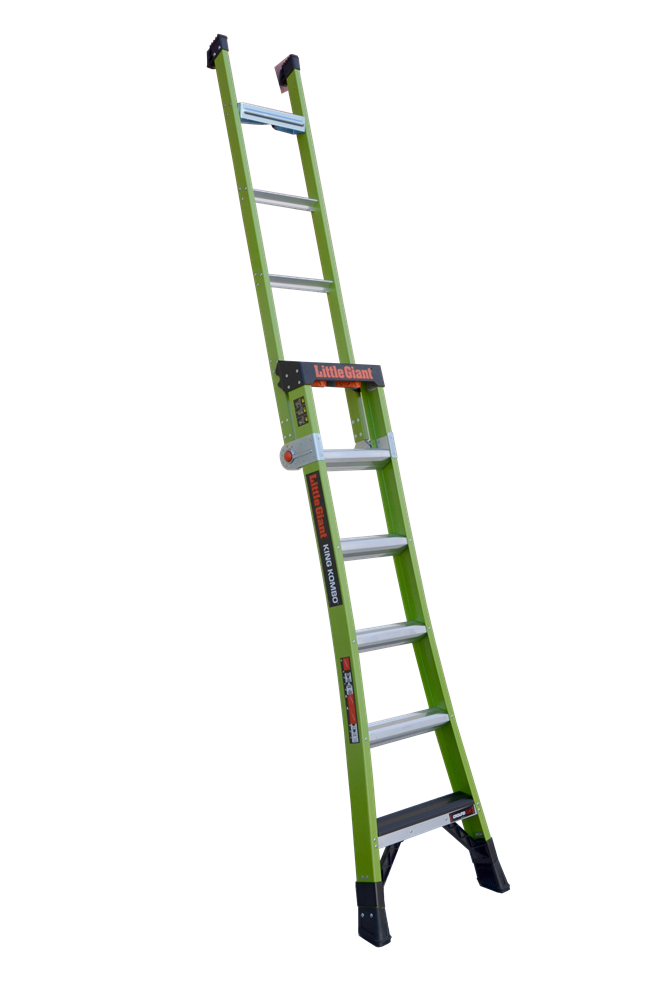Escalera de fibra de vidrio transformable para trabajar en apoyo o en tijera, dispone de soportes para trabajar en columnas o en esquinas en ambas posiciones. Equipada con peldaño sonoro que avisa al operario de que ha llegado al final de la escalera, cuando este desciende de espalda.