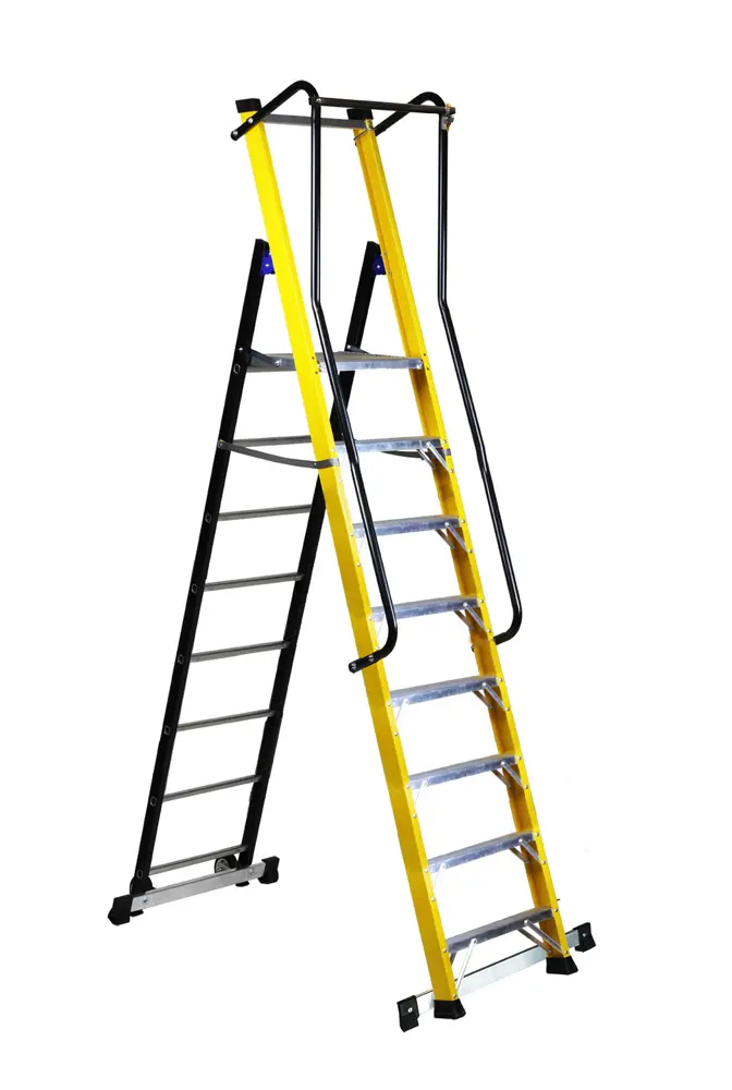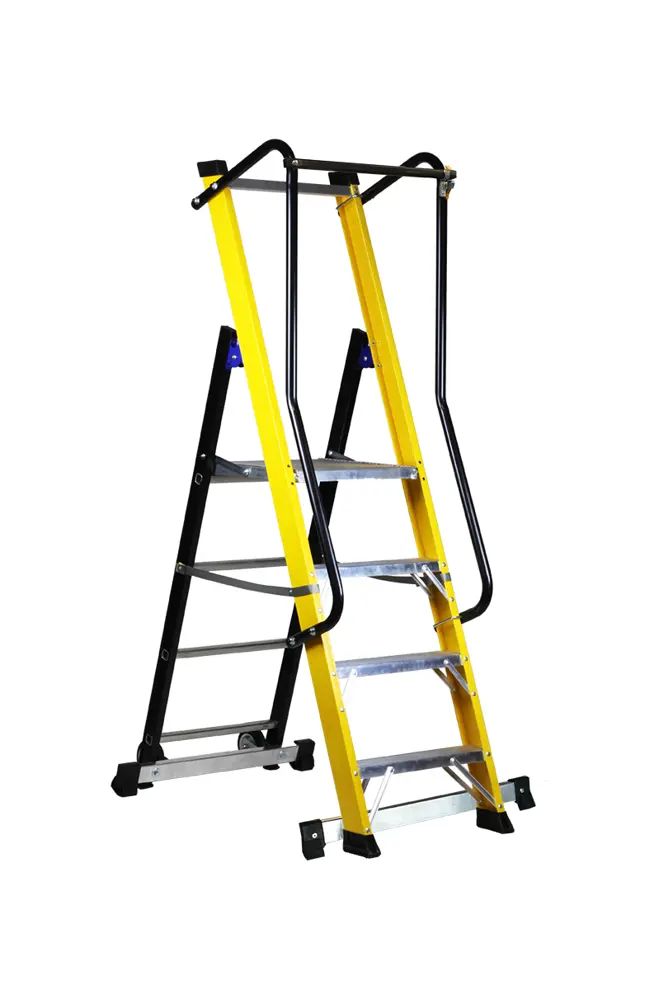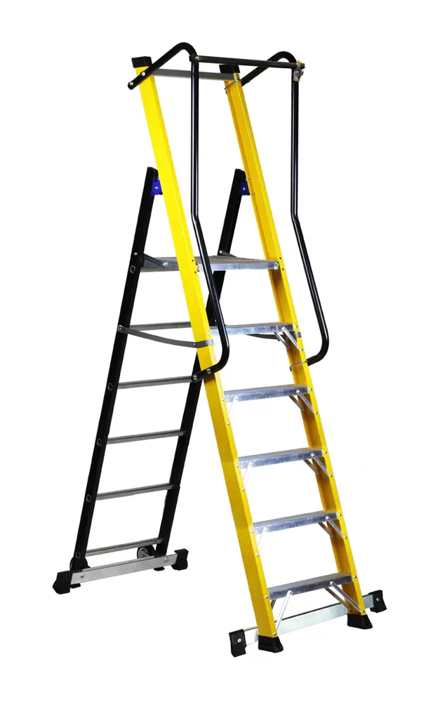 Escalera profesional con plataforma y cierre perimetral de fibra de vidrio aislante
