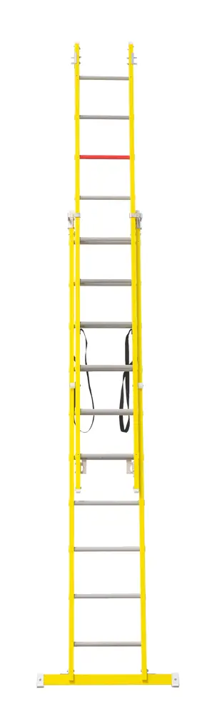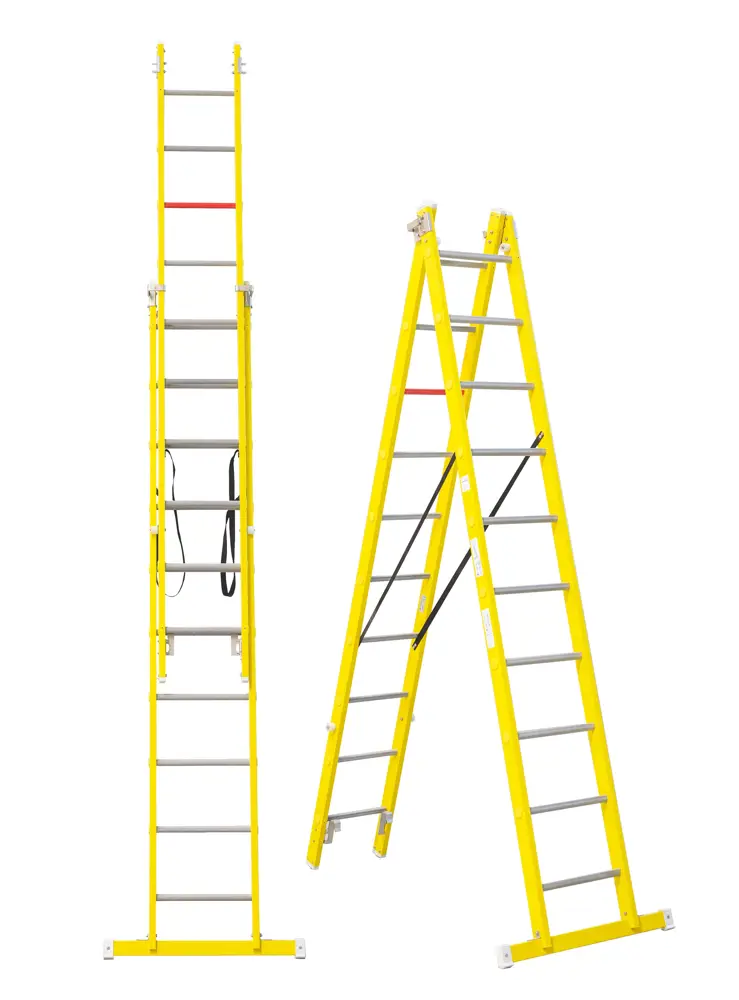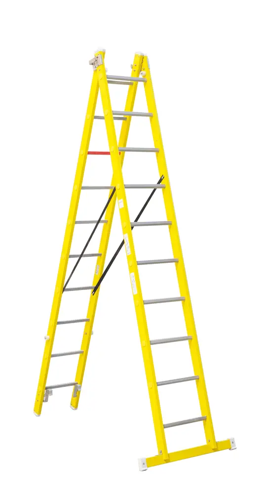 Escalera transformable de 2 tramos, fabricada en fibra de vidrio para aislar de la corriente eléctrica a los operarios que trabajan próximos a tomas de corriente, cables u otras fuentes de energía eléctrica. Ensambladas mediante un avanzado sistema automático que fija de modo duradero los peldaños a los montantes.