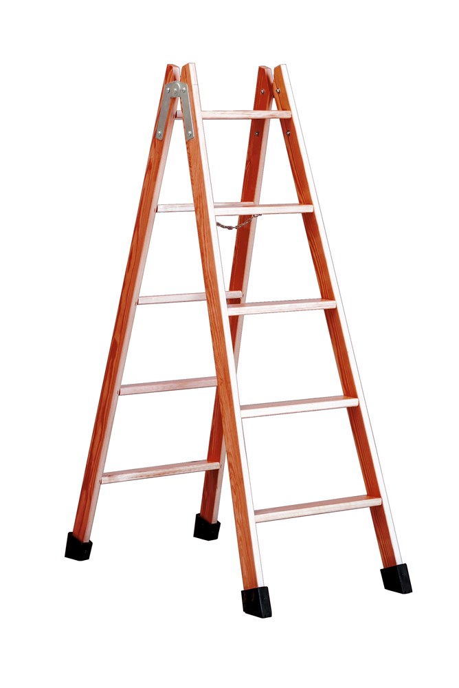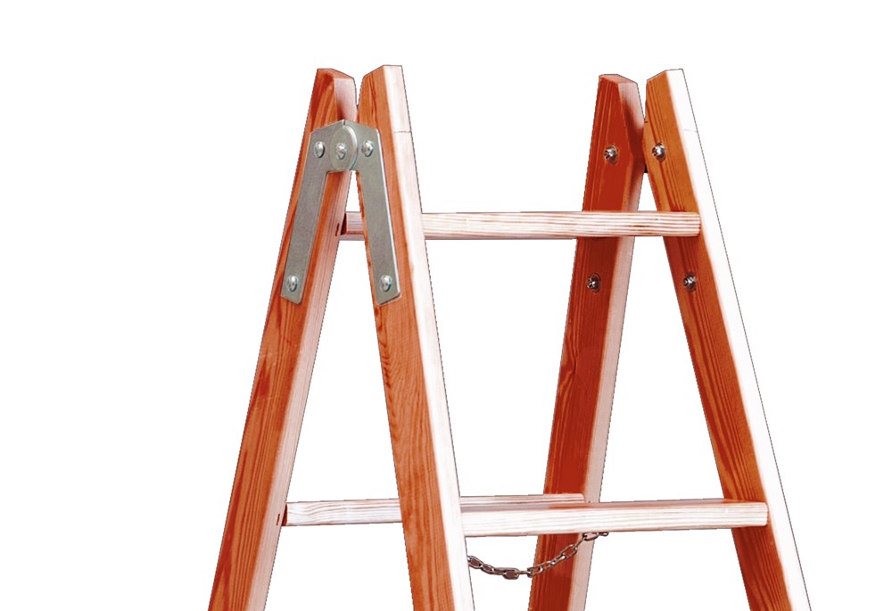 Escalera de tijera de madera de doble subida, fabricada en madera barnizada con bisagra de acero reforzada y cadena antiapertura. La norma UNE EN131 prohíbe subir a los 2 últimos peldaños en ausencia de plataforma o guardacuerpo.