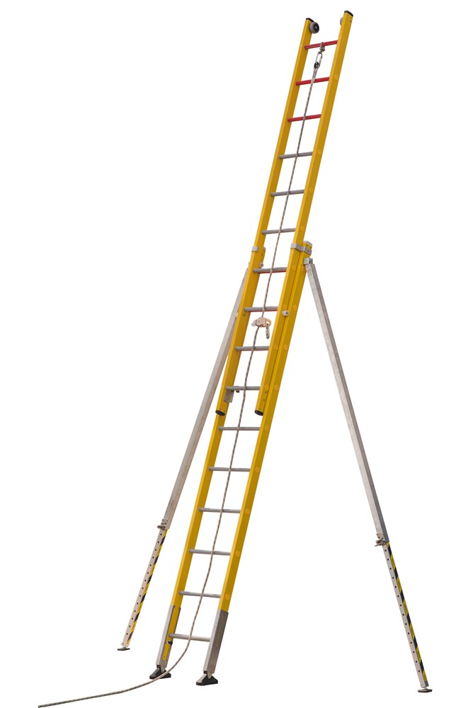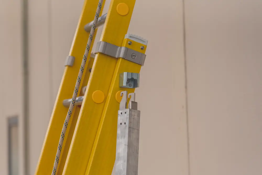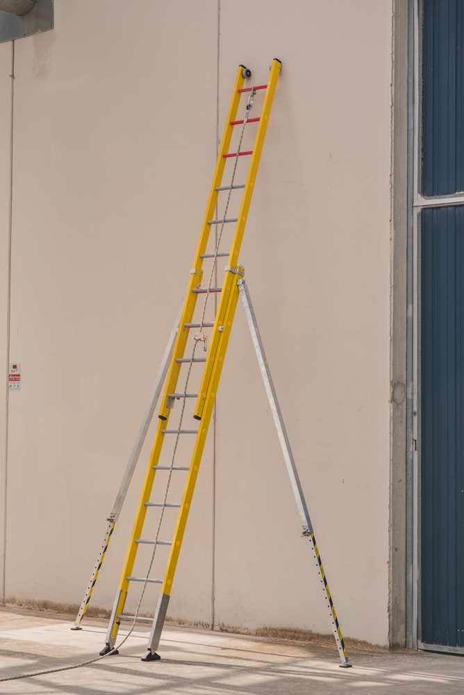 Escalera de seguridad profesional aislante completa de fibra de vidrio con punto de anclaje EN795-B y dispositivo anticaídas. Está considerada un puesto de trabajo seguro por encima de 2 m altura. Es antimagnética, resistente a la humedad, ácidos, corrosión y con un velo protector antirayos solares.