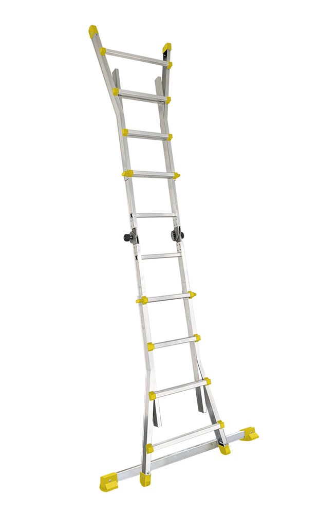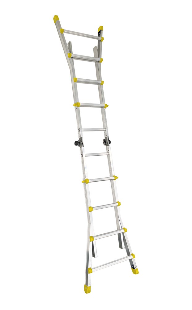 La Telestar de SVELT es una escalera telescópica transformable fabricada en aluminio ligero y resistente. Su bisagra automática de bloqueo permite desplegarla en distintas posiciones: extendida en apoyo, en tijera o incluso en desniveles y escaleras, ofreciendo siempre la máxima seguridad.