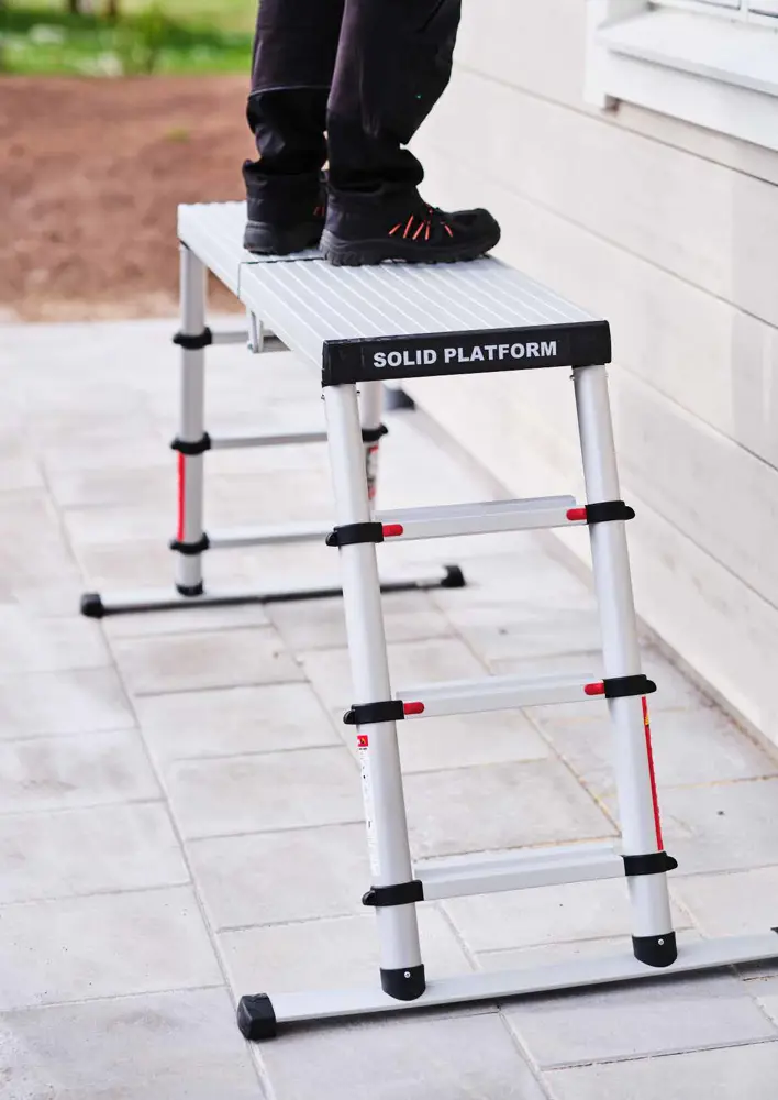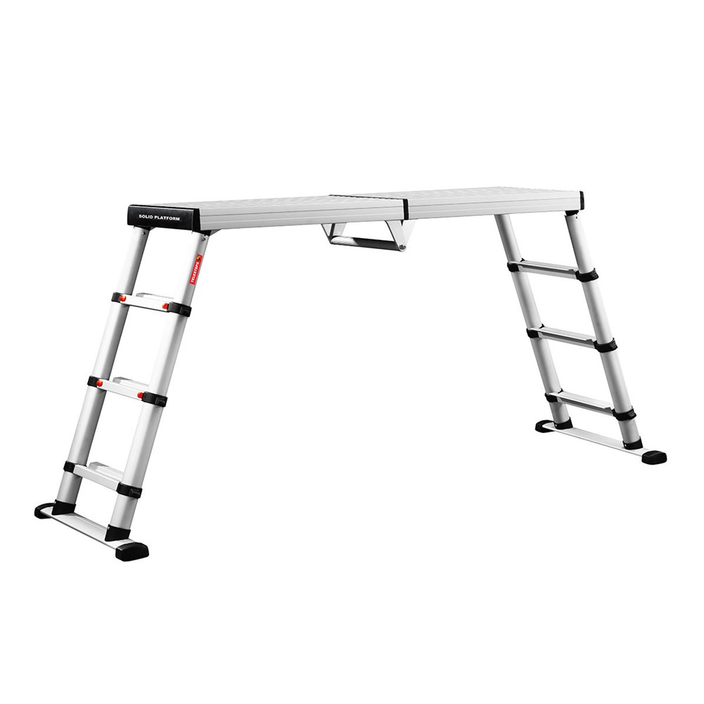 Fabricada en aluminio anodizado muy resistente, amplia superficie de trabajo y pies telescópicos que le permiten trabajar a tres alturas: 50/ 68 / 88 cm y además se puede trabajar en desnivel y sobre escaleras.