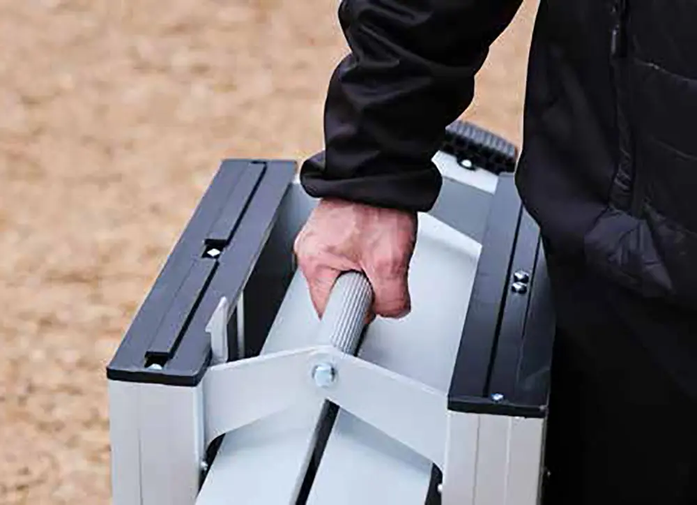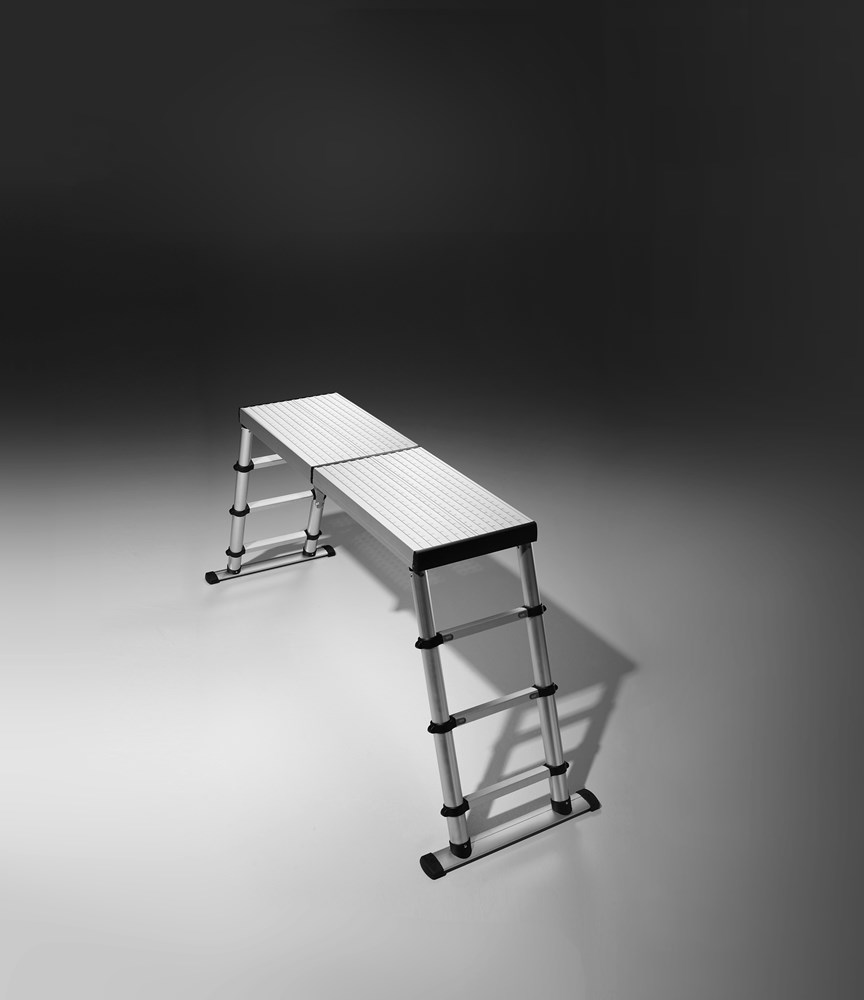 Banco de trabajo muy seguro indicado para uso profesional, su plataforma se ajusta a tres alturas diferentes y al plegarse ocupa el espacio de un maletín sencillo de transportar.