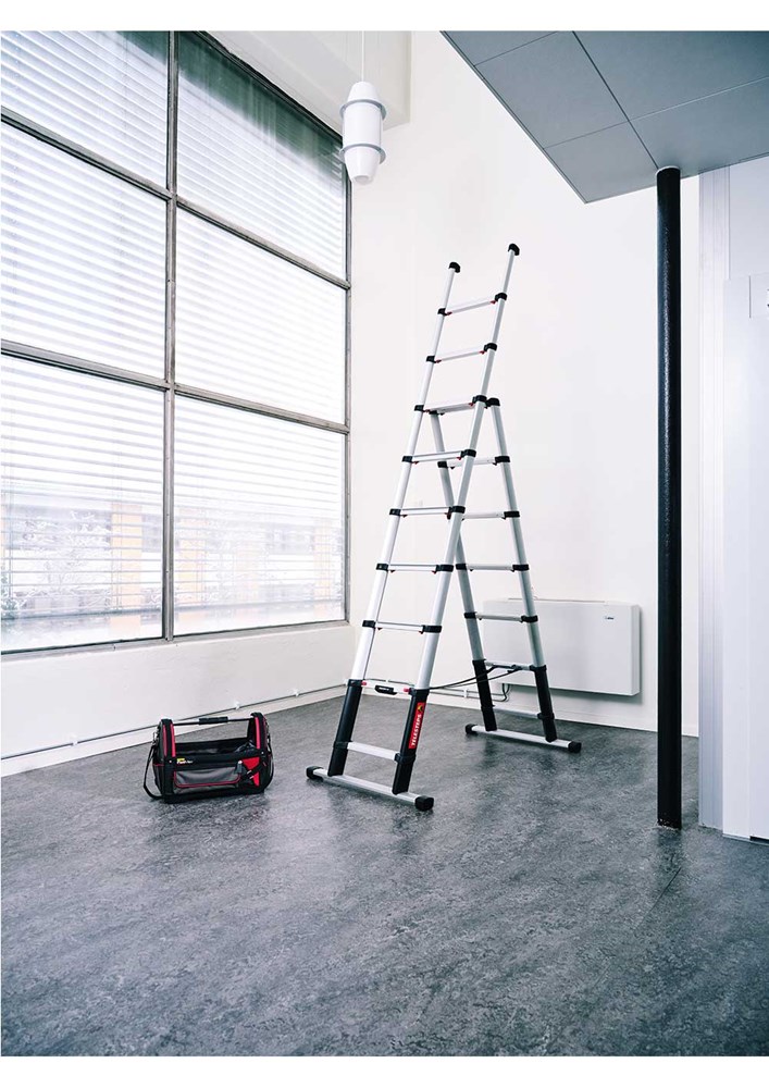 Escalera profesional de tijera telescópica aluminio anodizado. La escalera debe abrirse completamente para trabajar, solo se permite dejar plegado el guardacuerpo.