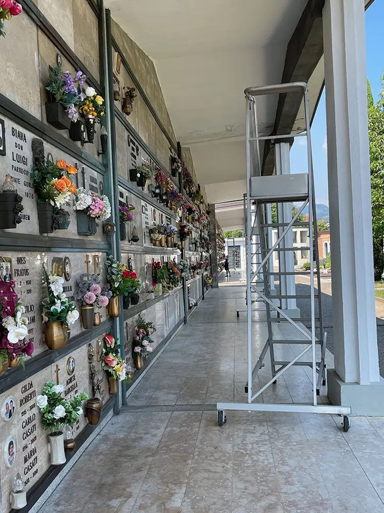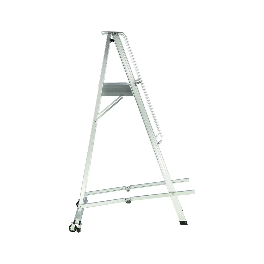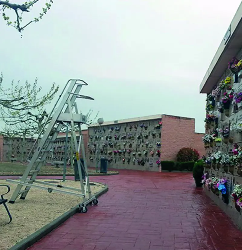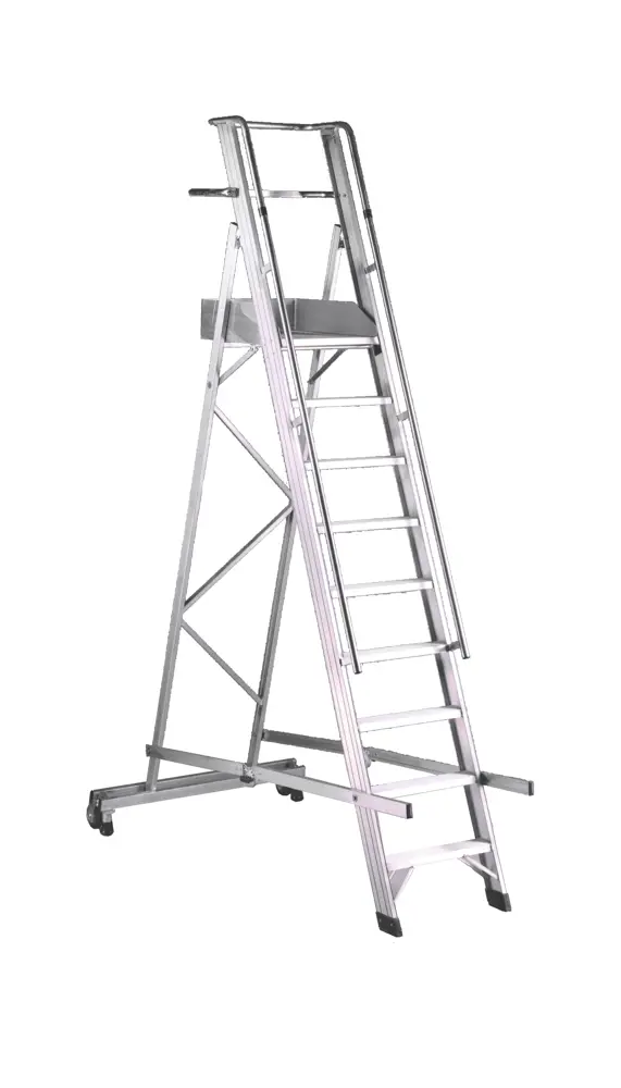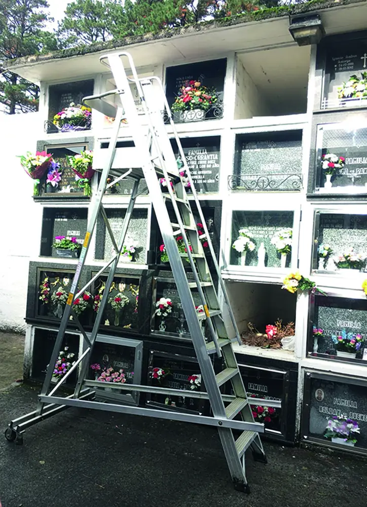 Escalera de aluminio de cementerios con plataforma y peldaños anchos, barandilla y guardacuerpo.