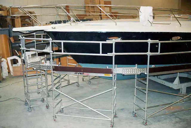 En aluminio en las ruedas de montaje, en movimiento, la rápida apertura y cierre, que permiten una pasarela 60 cm de ancho a lo largo de todo el perímetro de la embarcación para la construcción y mantenimiento de la pared, la proa, popa y la pintura de la línea de flotación. Los operadores también pueden trabajar en la manta como el carro actúa como un cinturón de seguridad en el caso de una caída.
