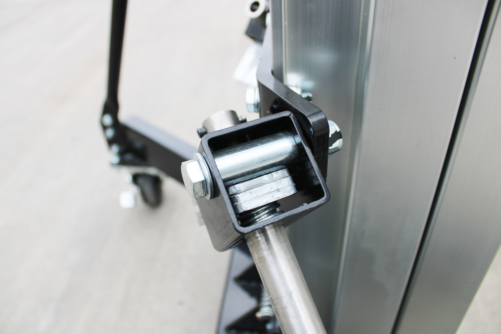 Su diseño incluye ruedas pivotantes con freno que facilitan la maniobrabilidad en distintas superficies y permiten posicionar el elevador de forma segura en el lugar de trabajo.
