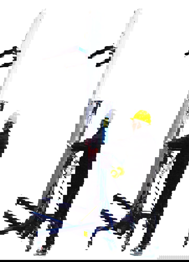 El Hercules se desplaza manualmente hasta la zona de trabajo y eleva la carga mediante un sistema mecánico accionado por manivela. Este sistema permite subir y bajar los materiales de forma progresiva y controlada. Una vez posicionada la carga, los frenos de las ruedas aseguran la estabilidad durante la operación.