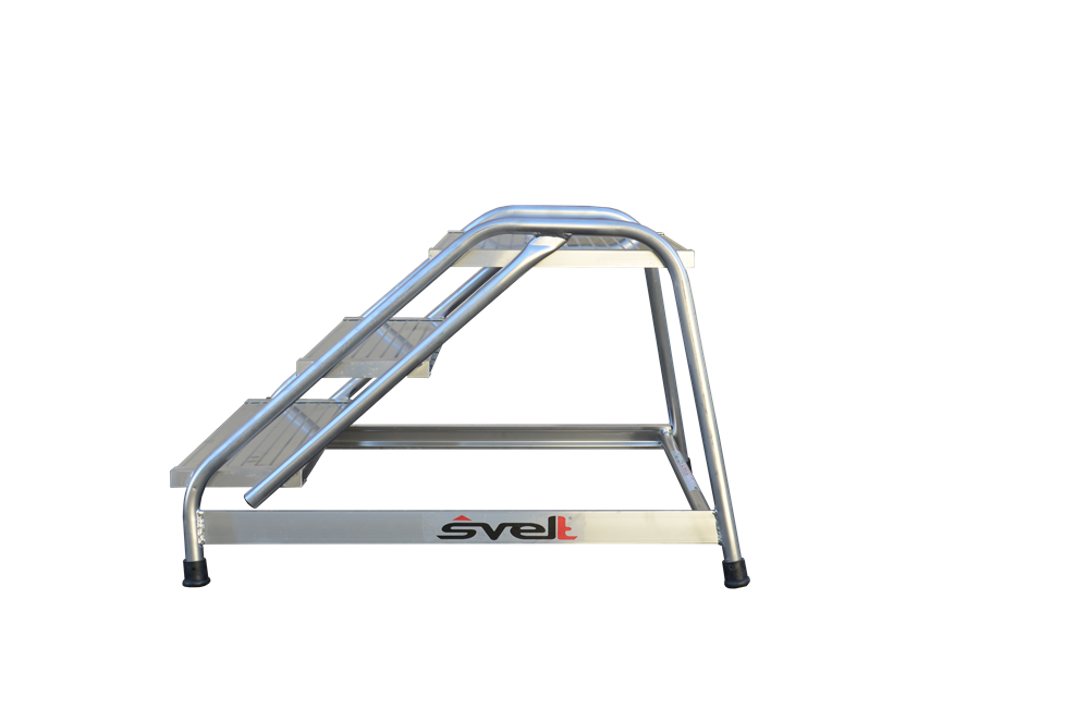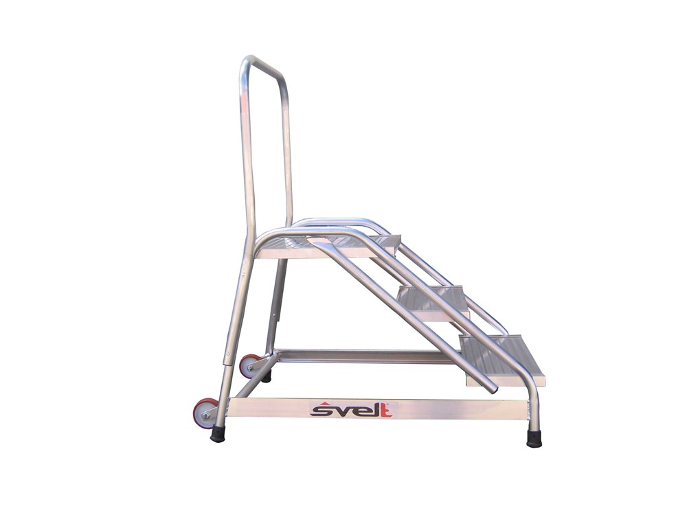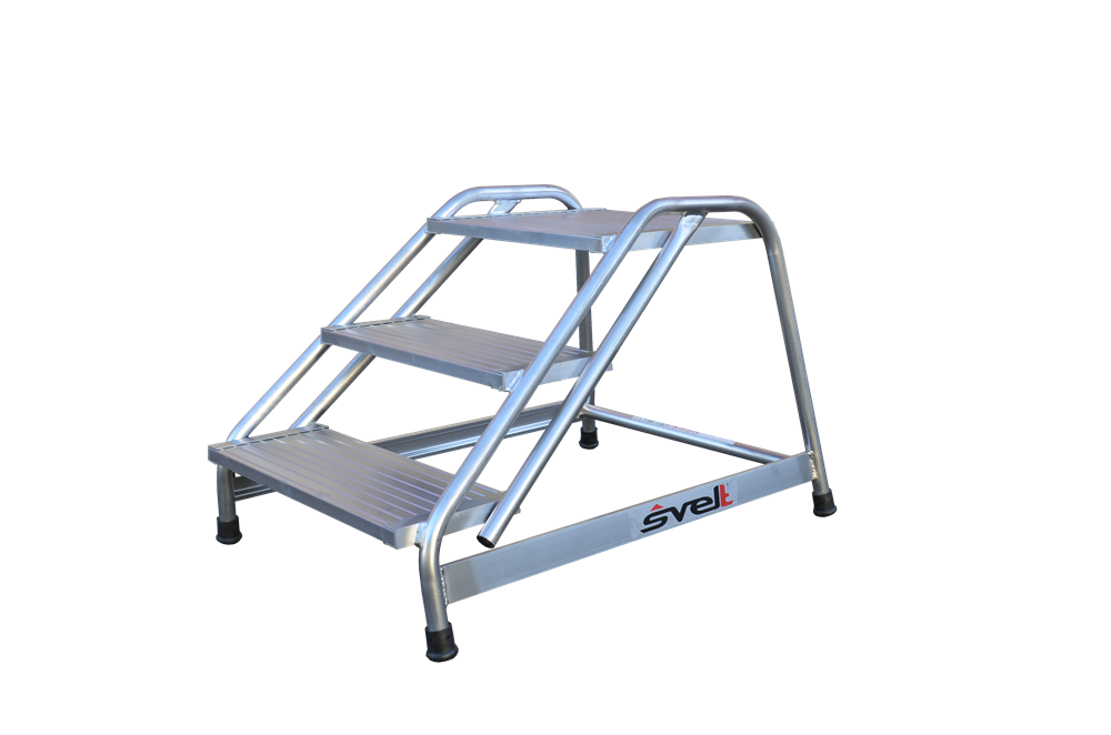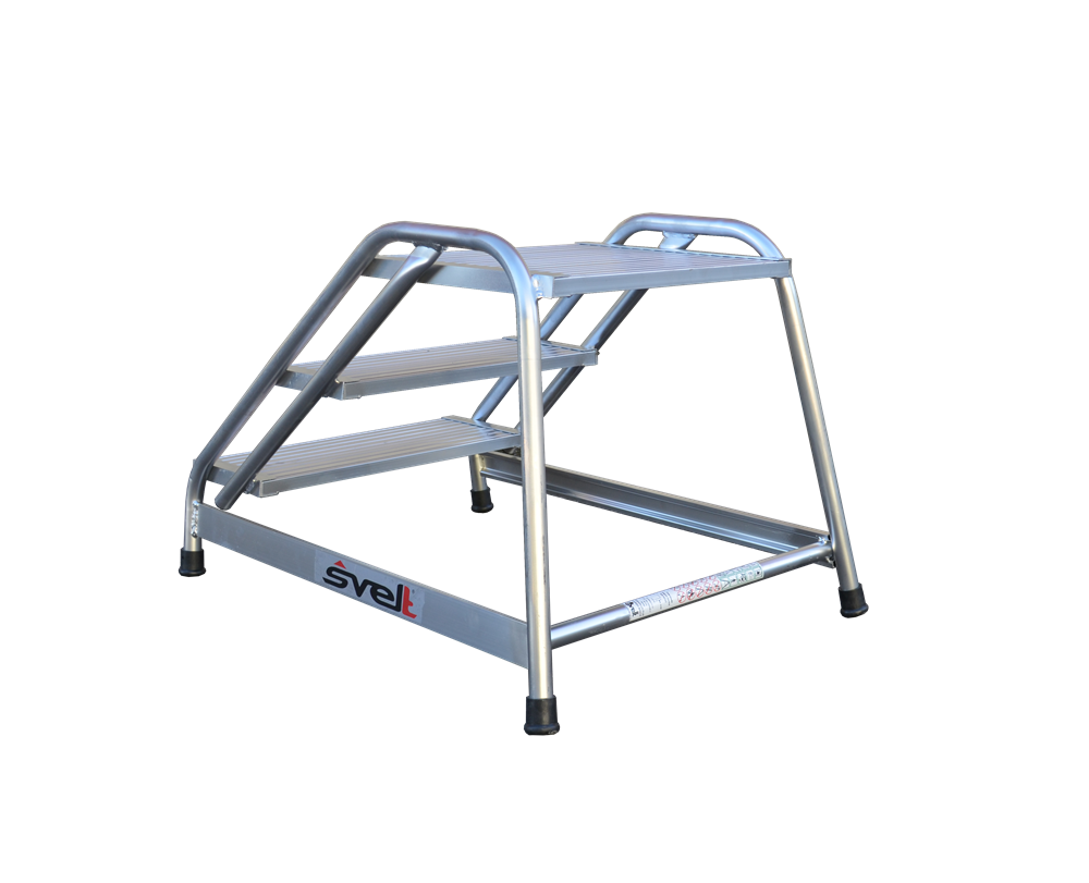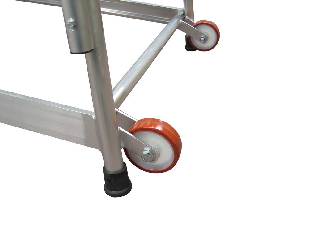 Está equipado con una plataforma de grandes dimensiones 50 x 48 cm que permiten junto con su ángulo de 40º comodidad y seguridad para el trabajo. Dispone de peldaños grandes grecados en aluminio, soldados a una robusta estructura tubular.