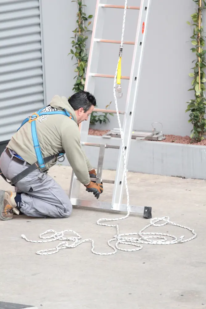 - La corde équipée d’un dispositif antichute est fixée au support supérieur.