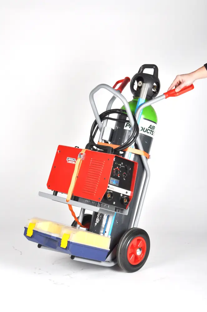 Chariot en acier professionnel pour le transport de soudeuses avec boîte à outils et relative à outils.