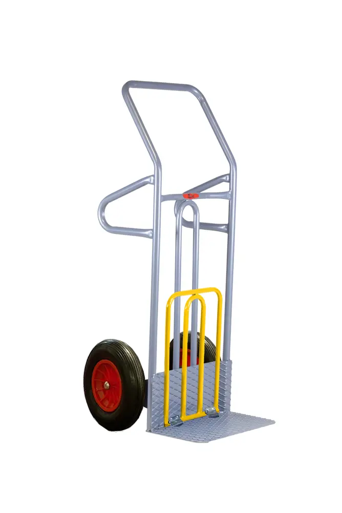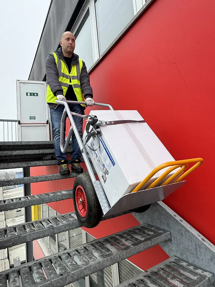 Posé au sol, le chariot peut être chargé horizontalement car les poignées le maintiennent parfaitement à niveau par rapport aux roues.