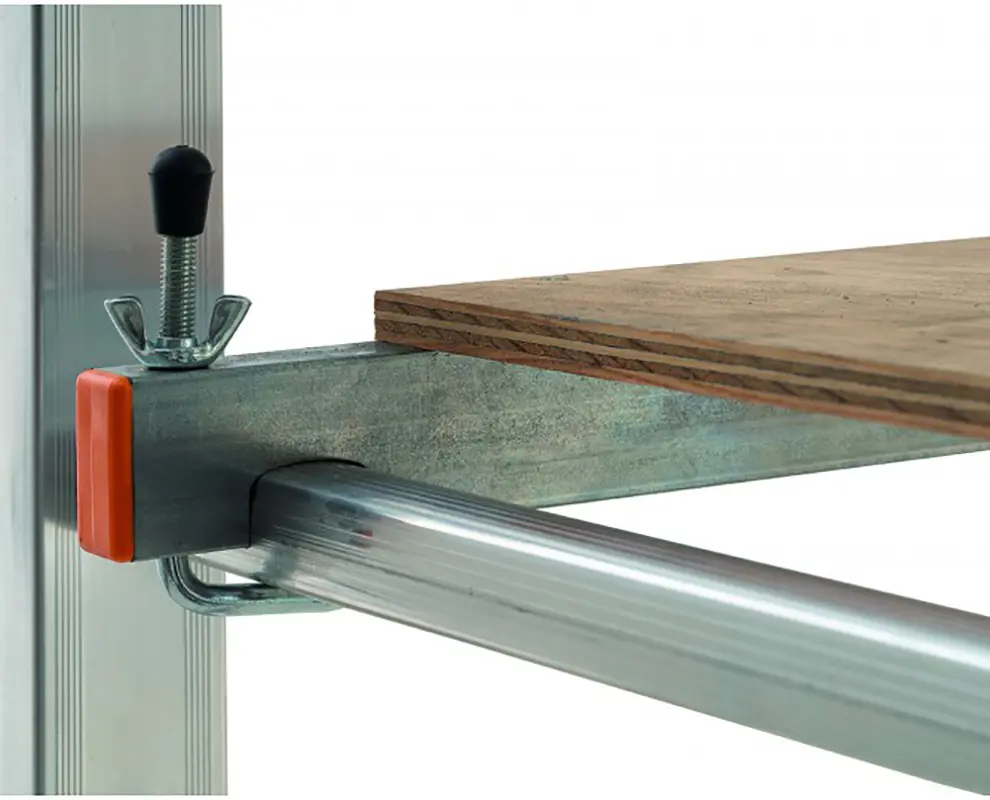 Deux tiges de traverse en acier galvanisé avec un système de fixation vertical complètent l’échafaudage.