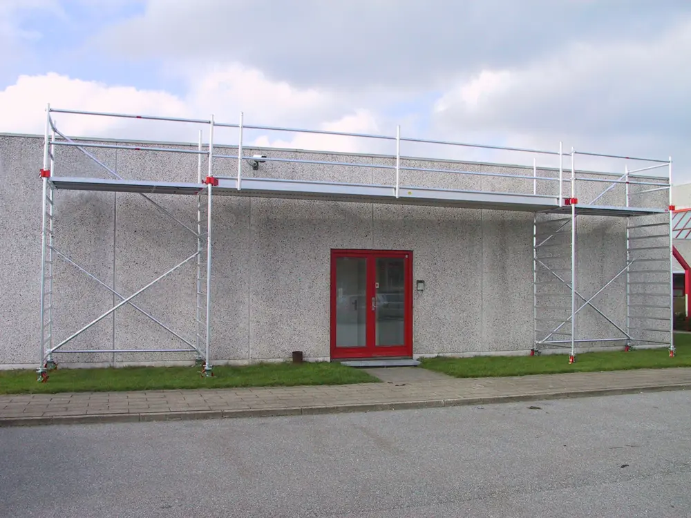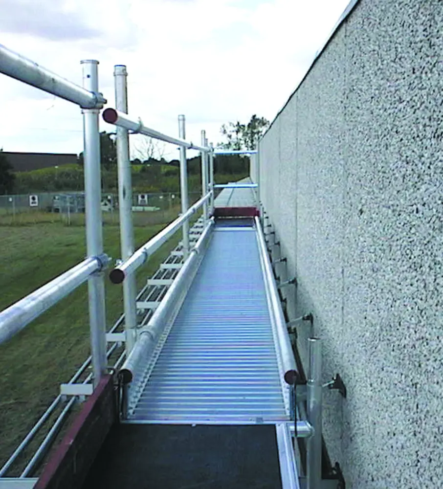 Chaque passerelle est équipée de crochets en acier aux extrémités, montés sur des tubes de 50 mm (échafaudage Tempo).