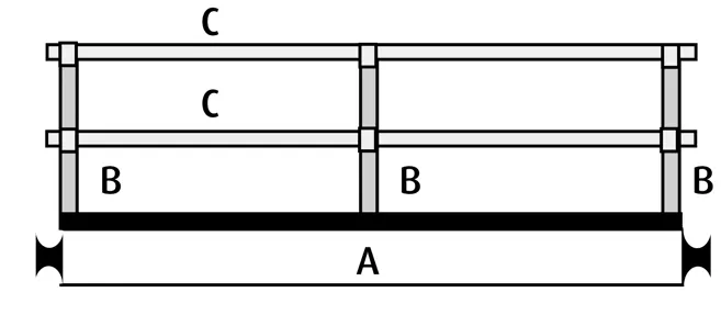 Le parapet est rapide à assembler et se compose de 2 poteaux B et de 2 rampes C de chaque côté (sauf pour les modèles BR06, BR07 et BR08 qui ont 3 poteaux).