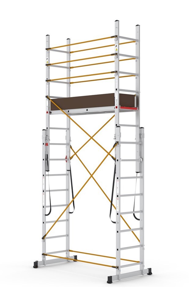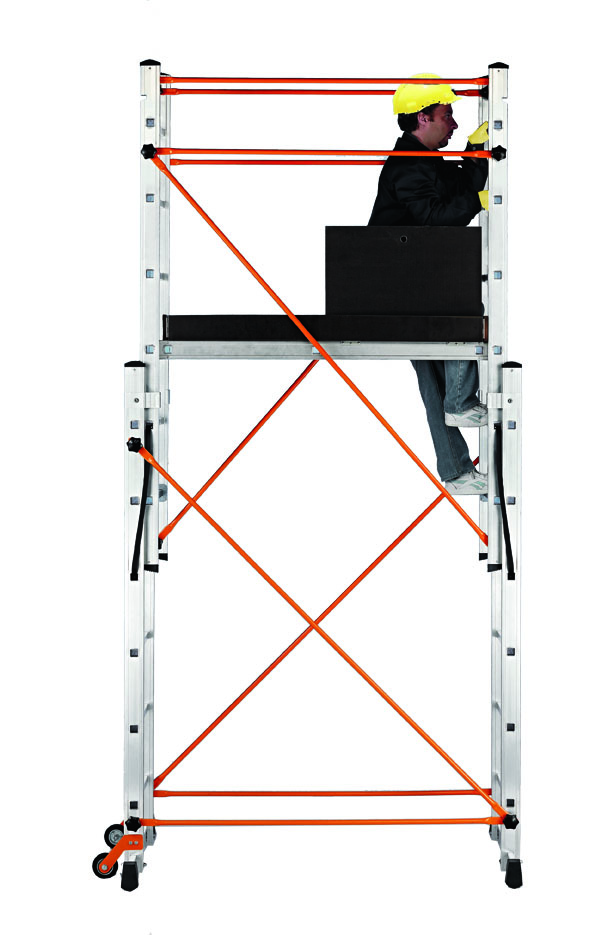 TARGET+ est un échafaudage constitué d’une combinaison géniale entre 2 échelles télescopiques et une série de traverses qui en rendent la structure rigide et stable.